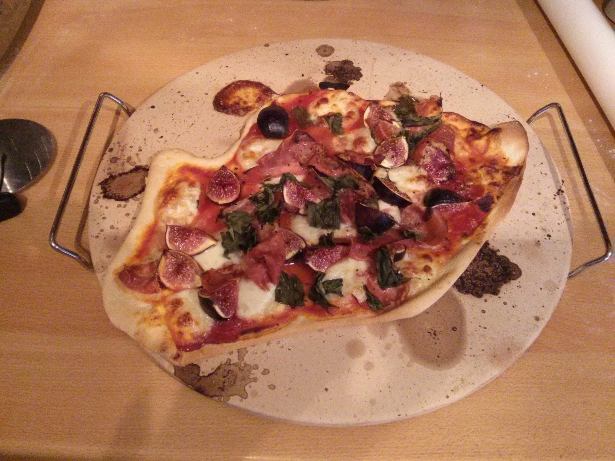 On goes mozzarella, figs, basil and prosciutto ham, black pepper then into the hottest oven we could get, on the pizza stone, for 10mins.
