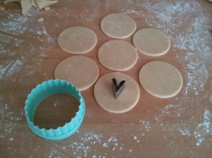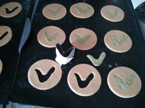 Now we’re onto the ‘inserts’. I made a V-shaped cookie cutter by cutting up the Stella can (other beers are available), and moulding it around the keyring work gave me. I cut out the V shaped from the middle of the round plain dough, and placed the green cuttings in there, using some whisked egg to help it stick.