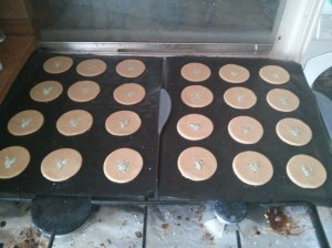 And you end up with a sticky green sugar. It gets clumpy pretty quickly and I needed to make two batches for the two trays fo cookies. Maybe I should look into buying, or making, coloured sugar…?