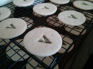 After 12mins at in the oven at 160c fan (180c regular) the green sugar has melted and I have cool stain glassed window Vs in my cookies. Yay!