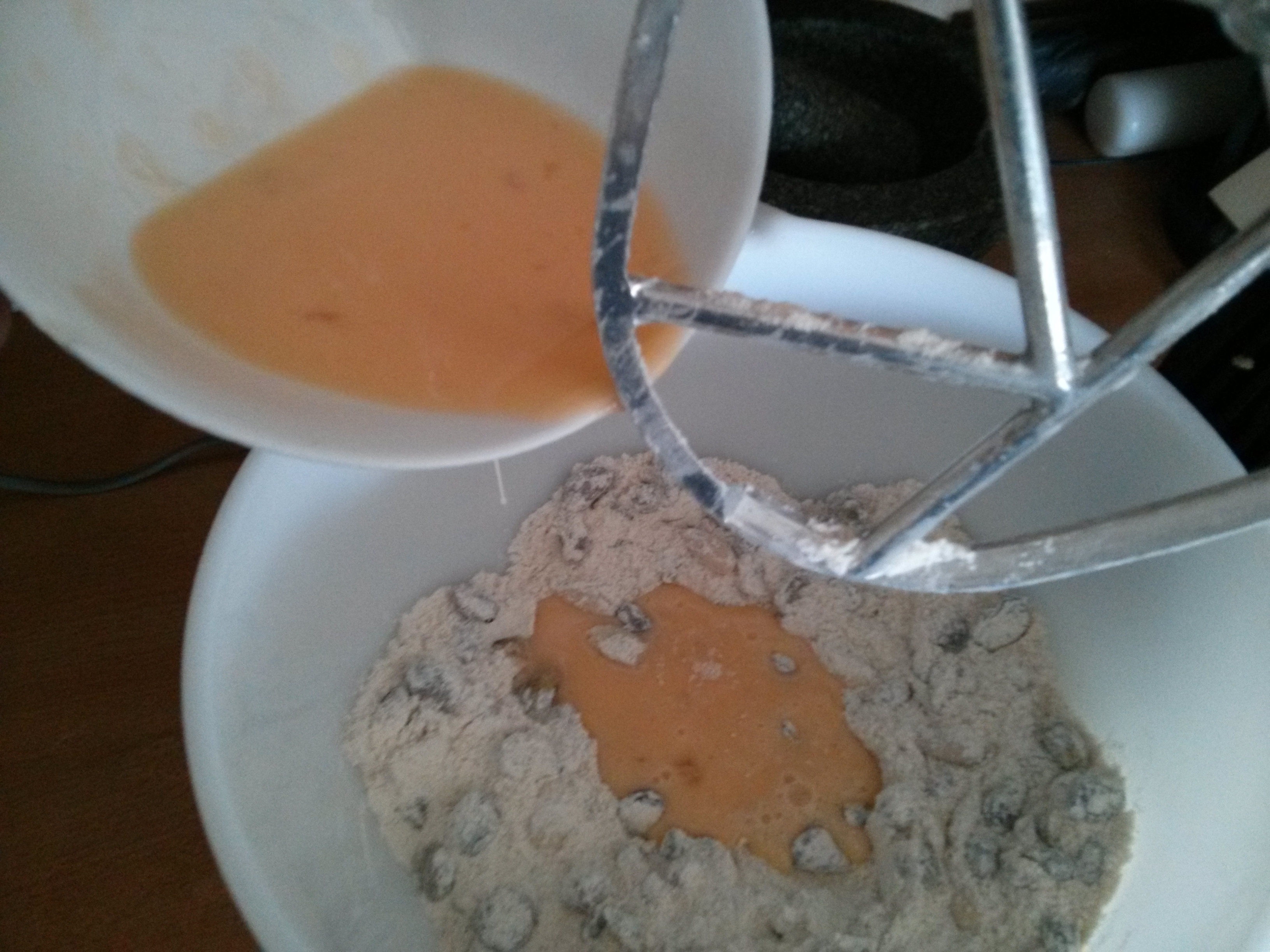 Now I start mixing. To start with it looks like there’s not nearly enough eggs to make a dough…