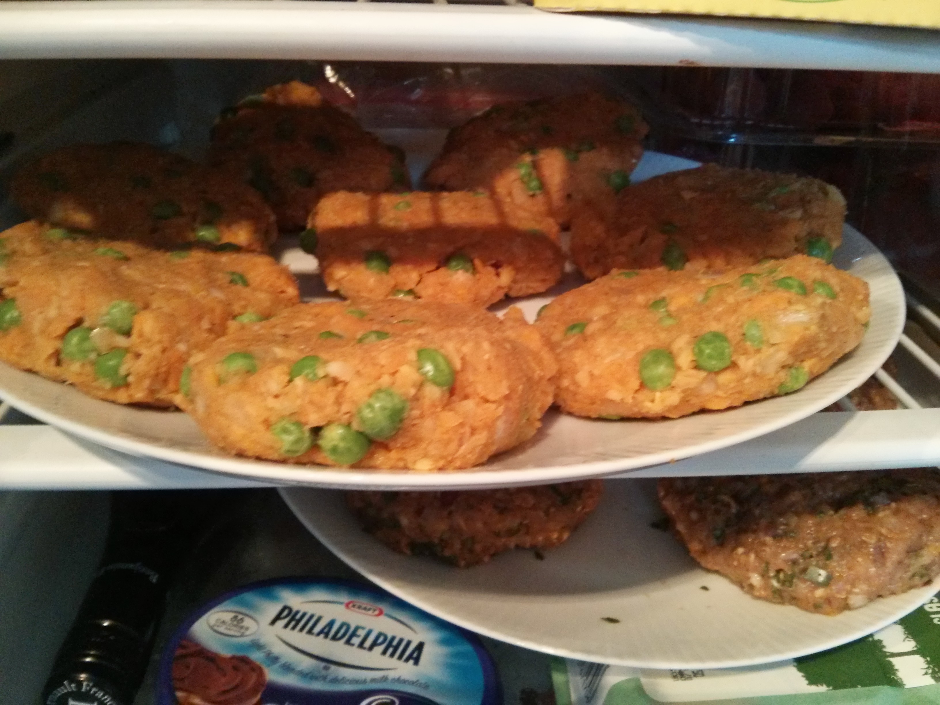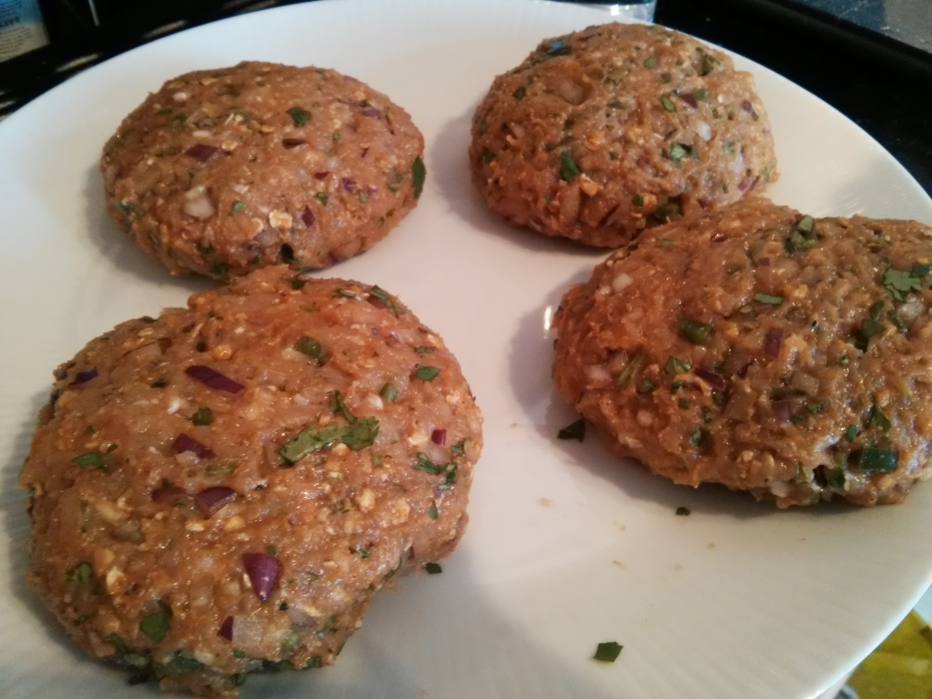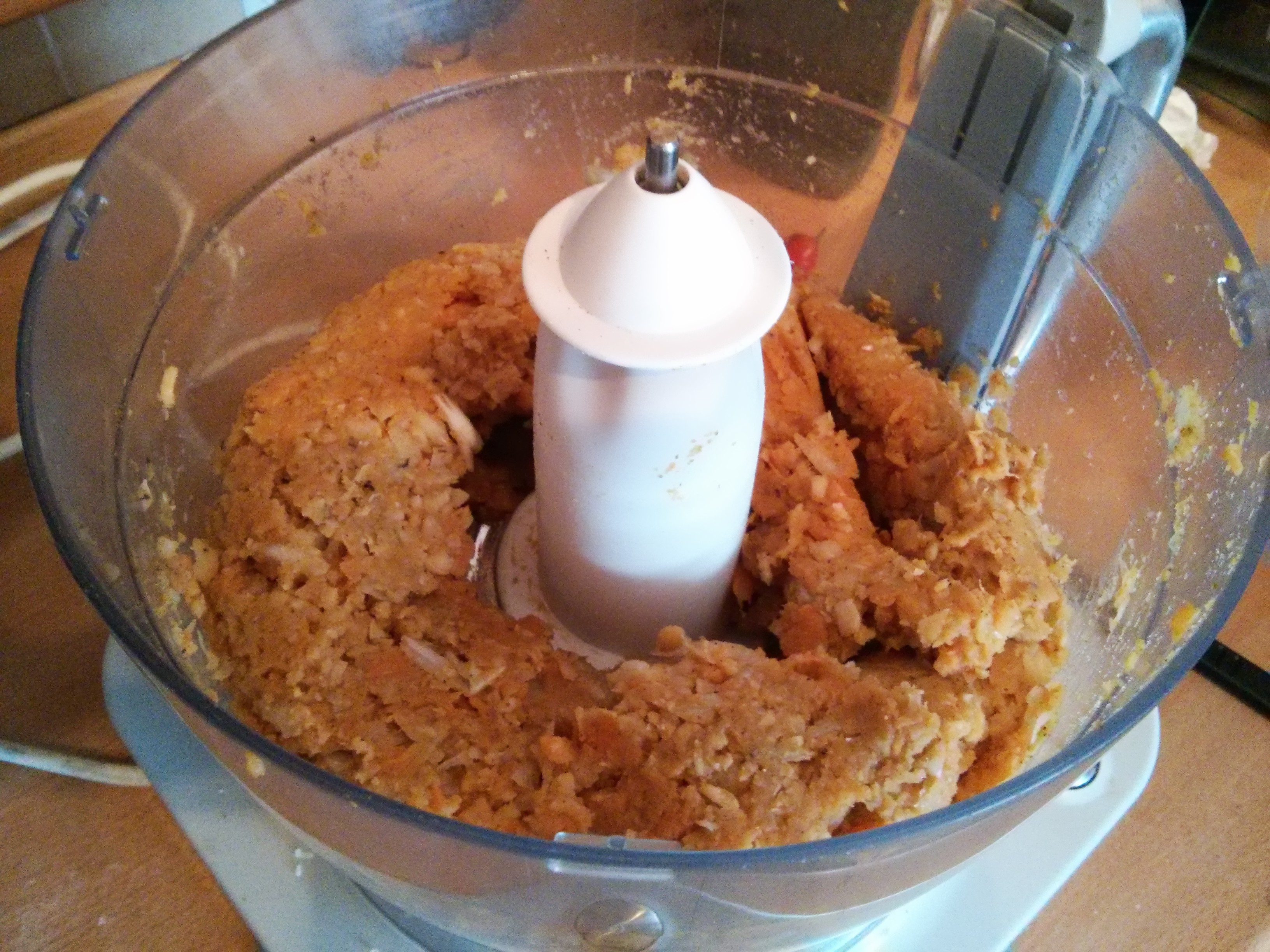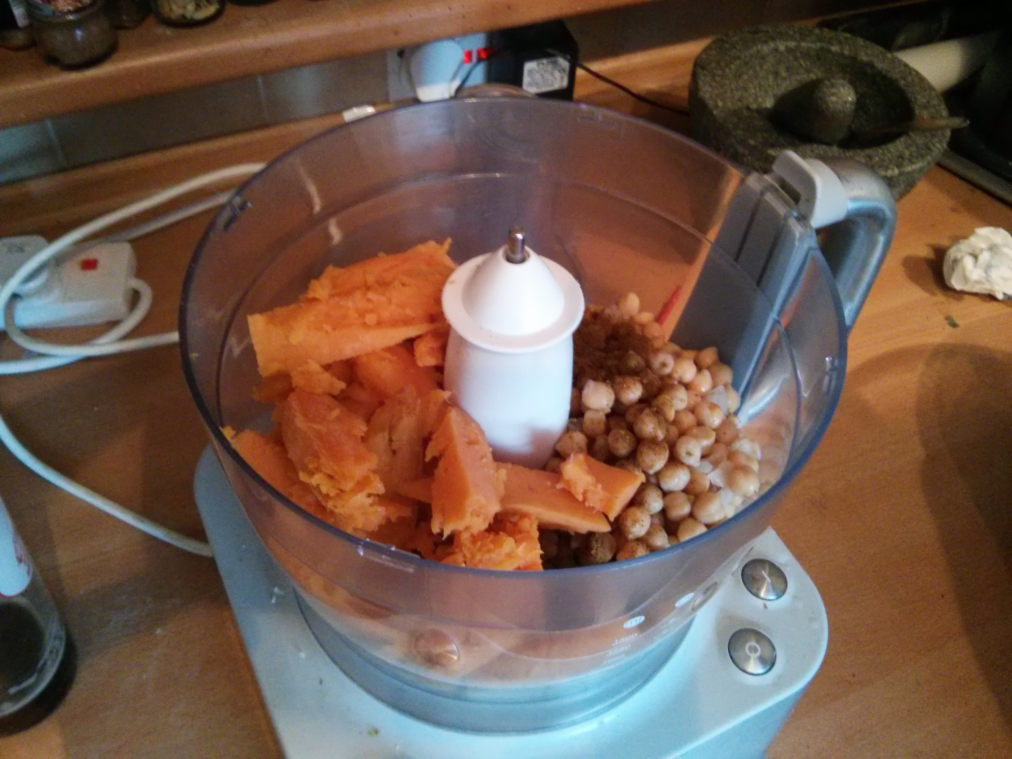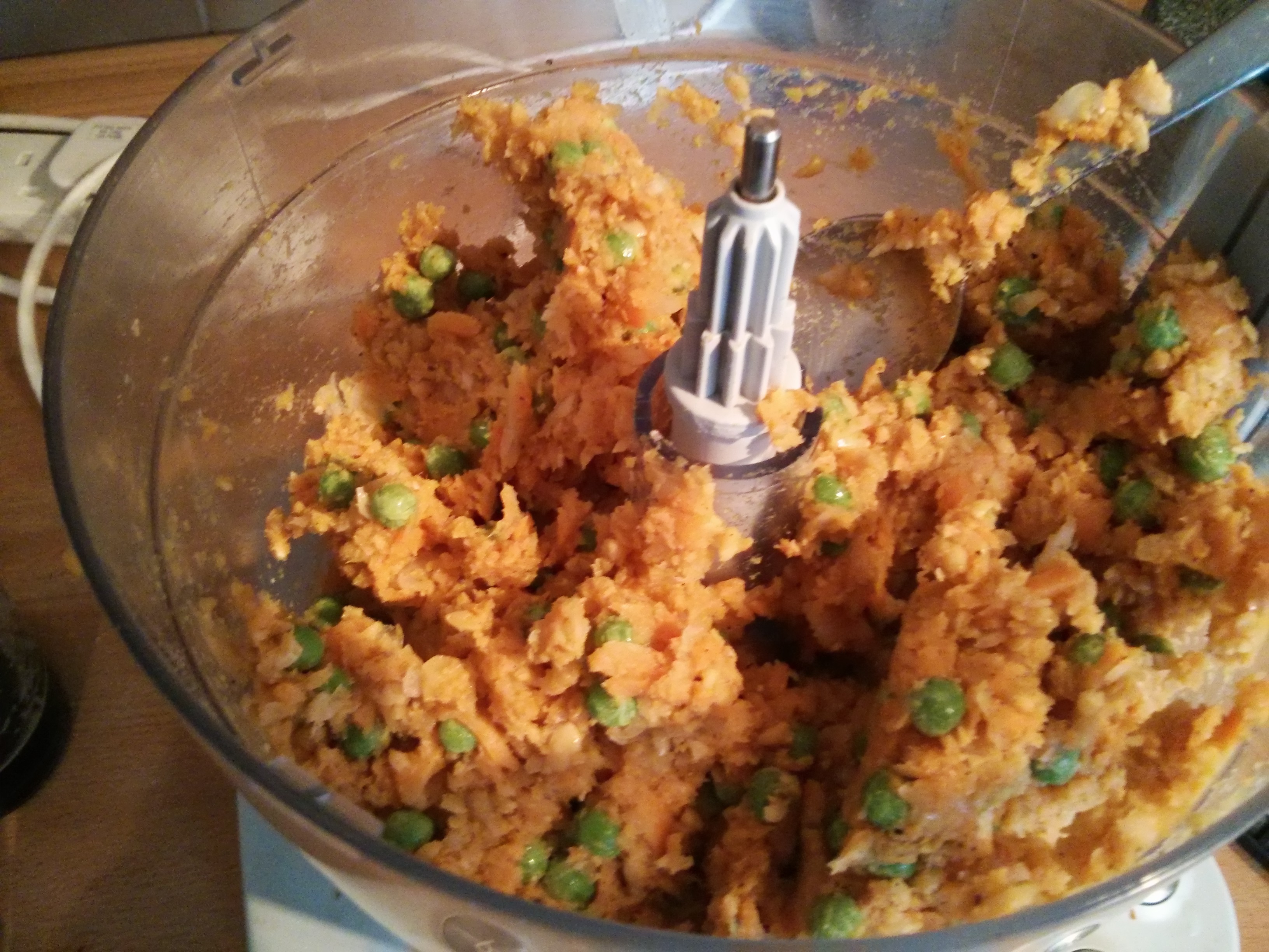 This goes in the food processor with a chopped onion, 2 tsp of garam masala, a can of chick peas, plus salt & pepper.