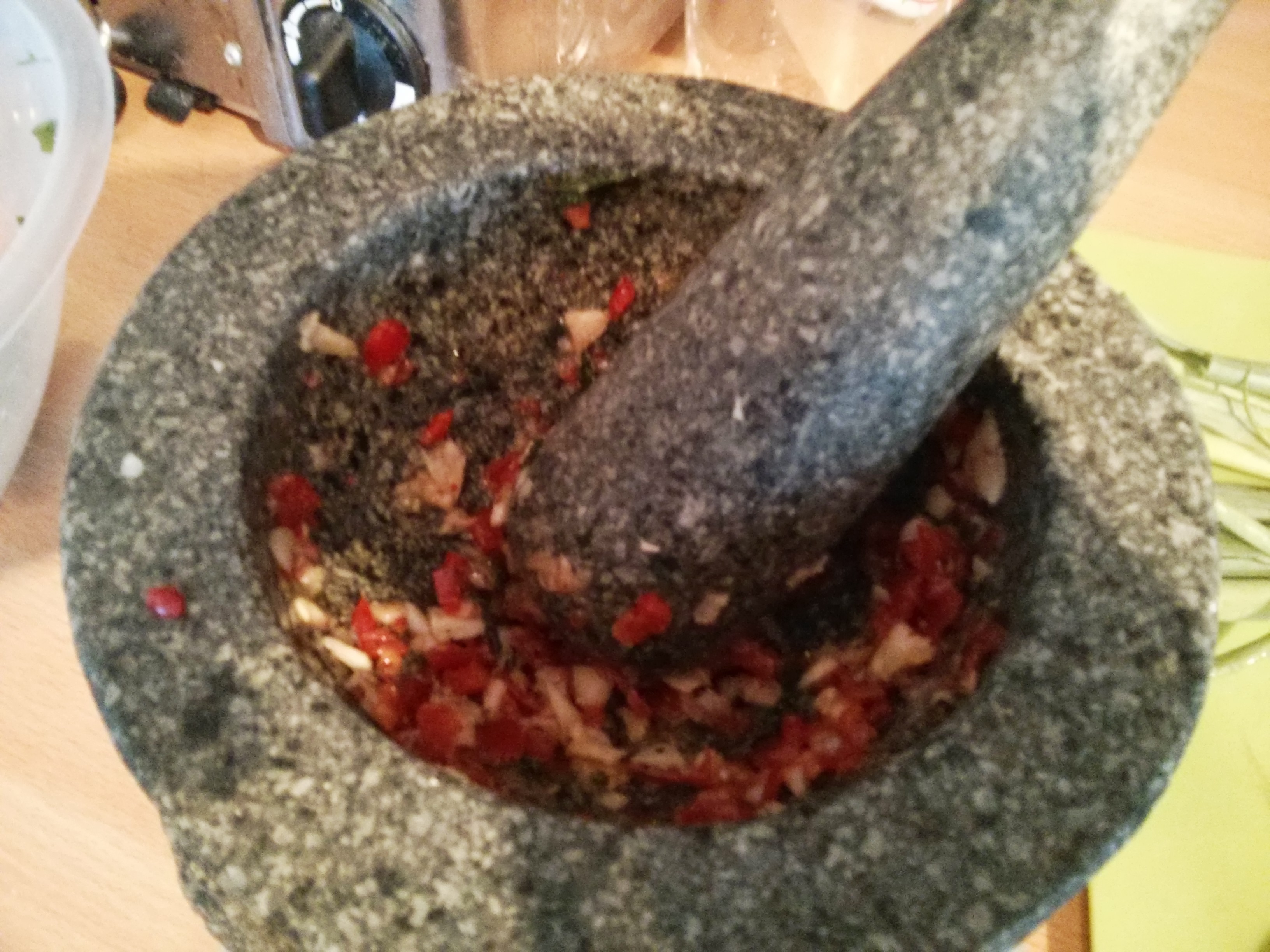 For the avocado & mango salsa, I mash up chillies, garlic, selt & pepper, and some fresh coriander.