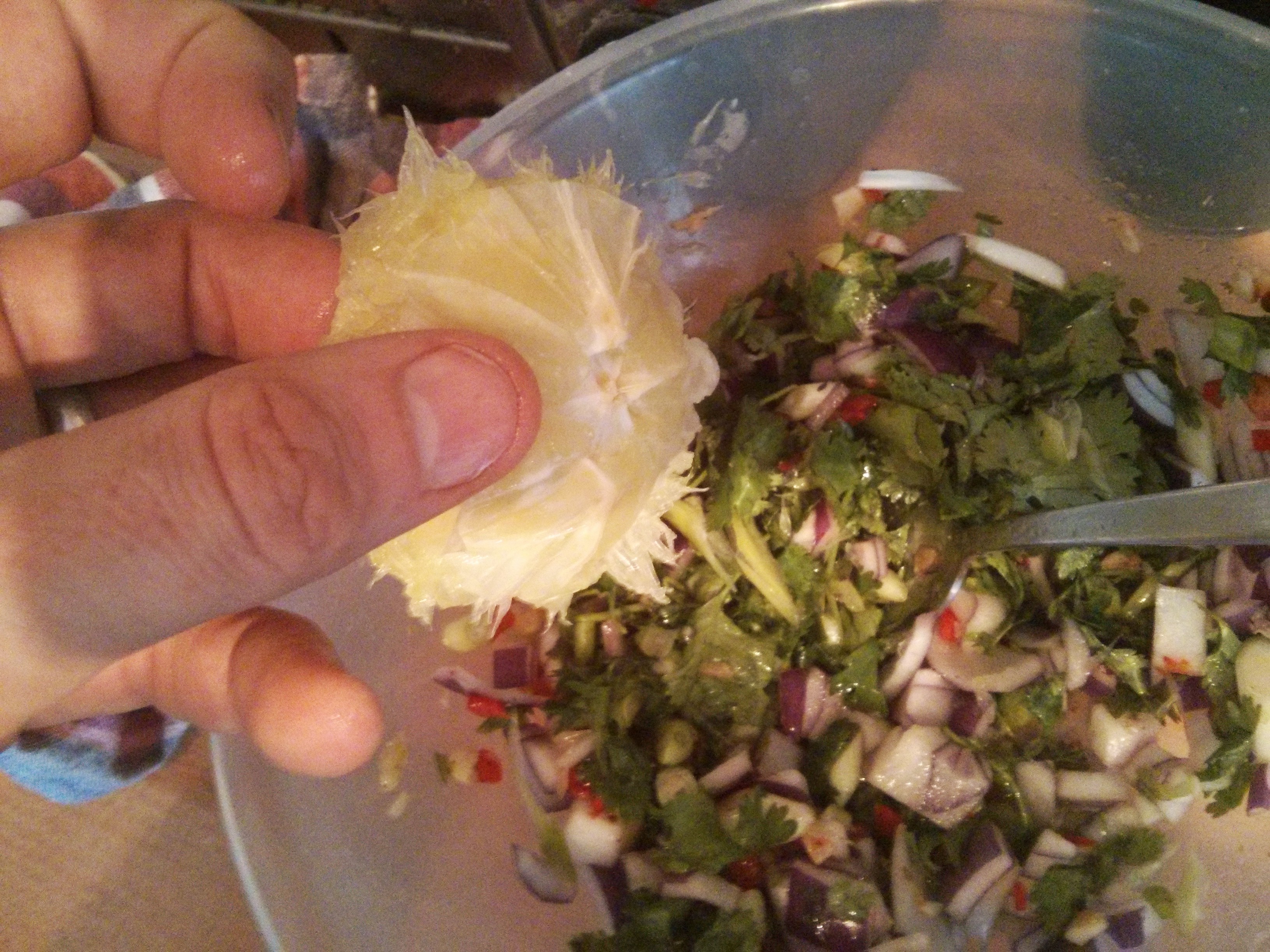 This gets added to chopped red onion, spring onions, torn up fresh coriander.