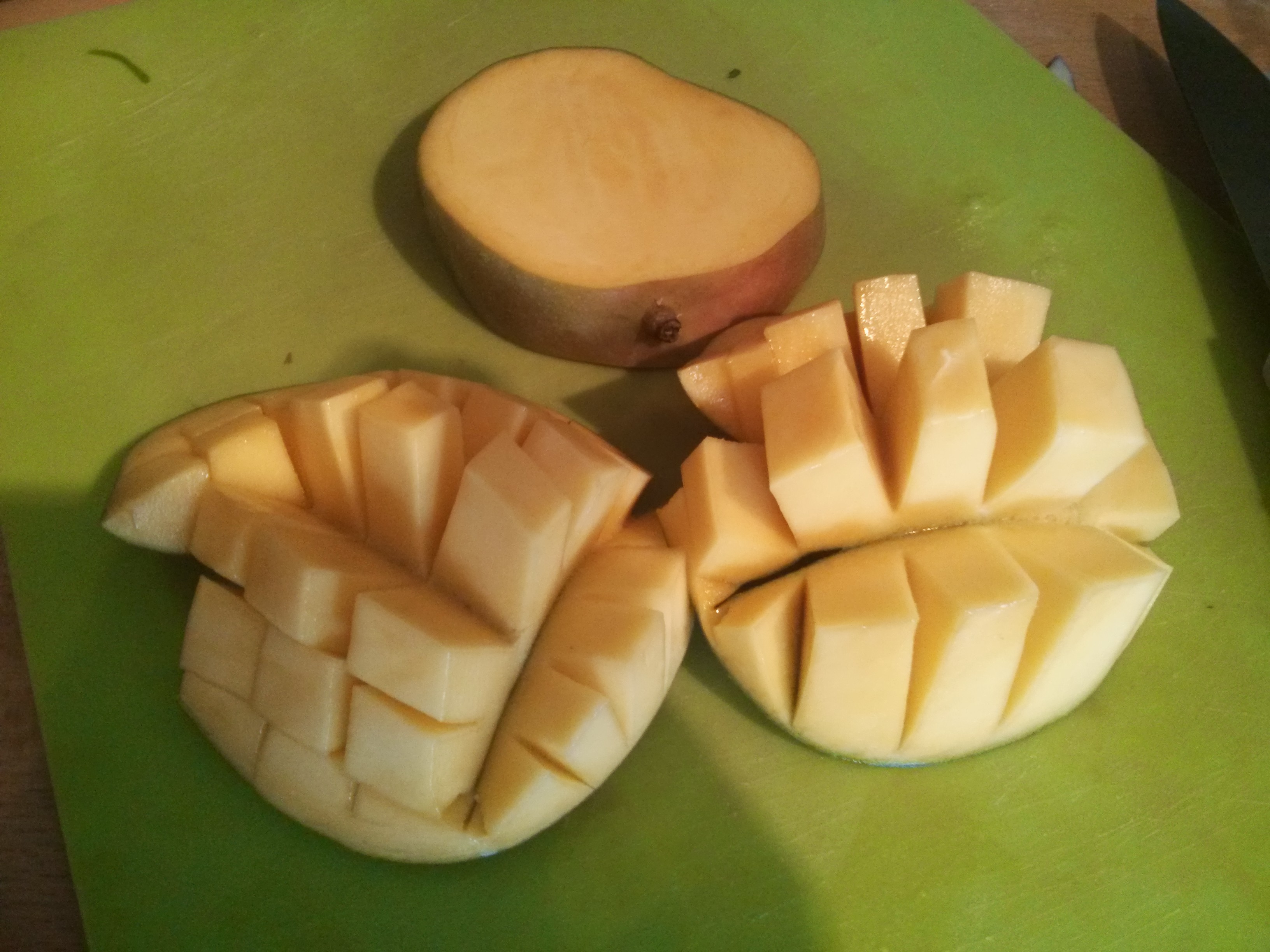 Soph taught me how to deal with mangos. Start by cutting down either side of the stone in the middle.