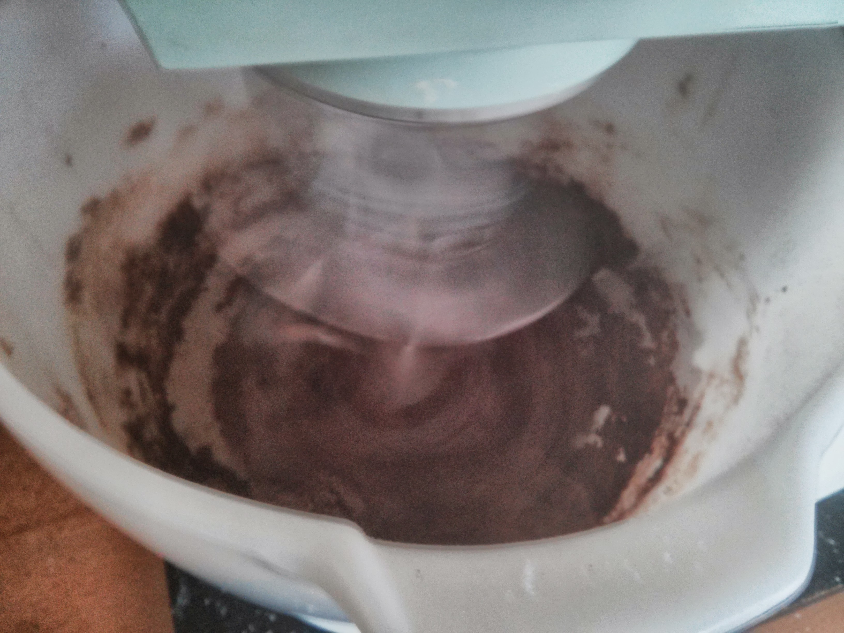 Then 1/2 a cup of unsweetened cocoa powder. Supposed to be Hershey’s… but as I’ve tasted their ‘chocolate’ I’m using real cocoa :P