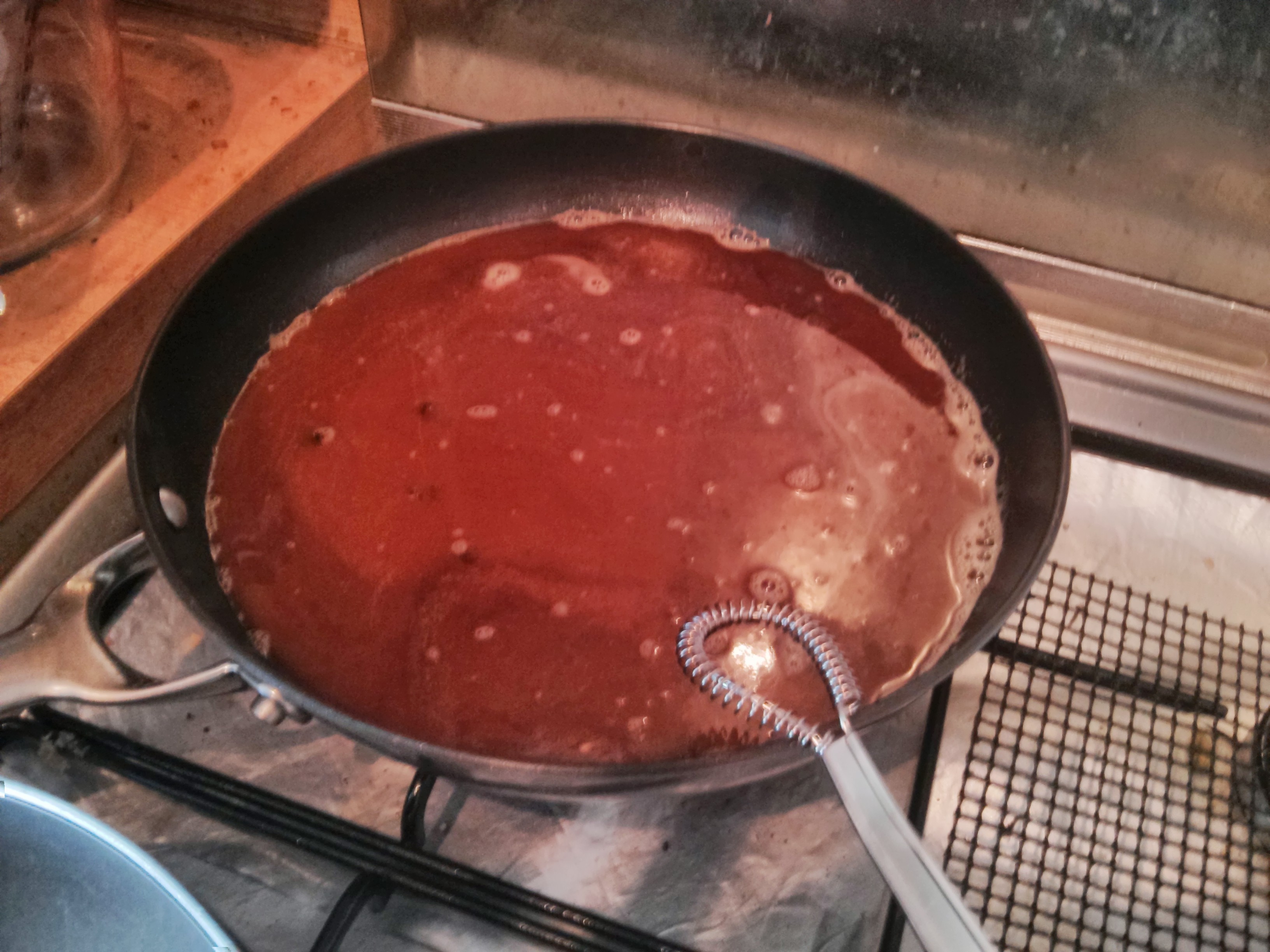 To that you add hoisin sauce, apricot jam, cornflour, balsamic vinegar, soy sauce, ginger, garlic and water. That goes into a frying pan to reduce.