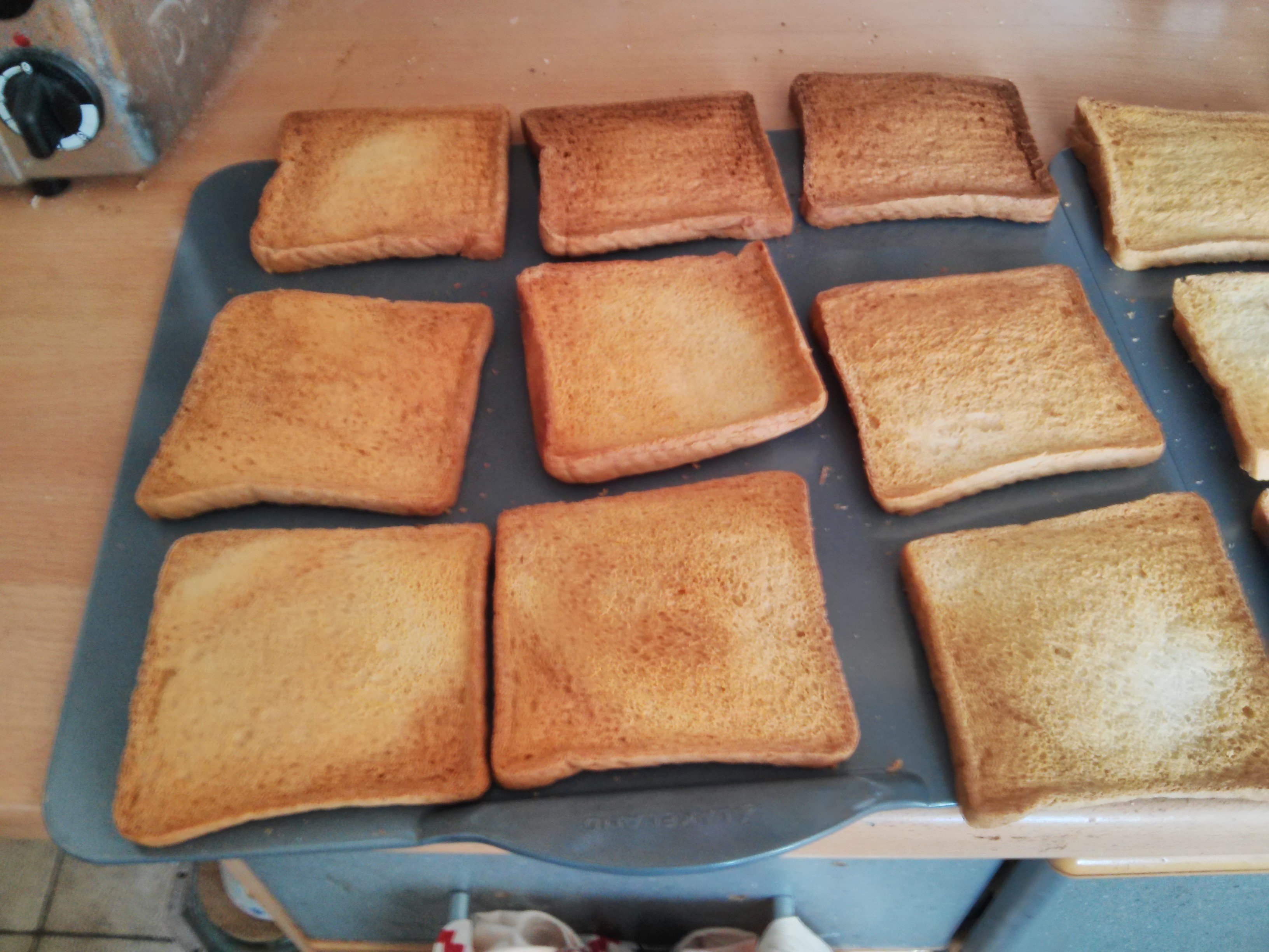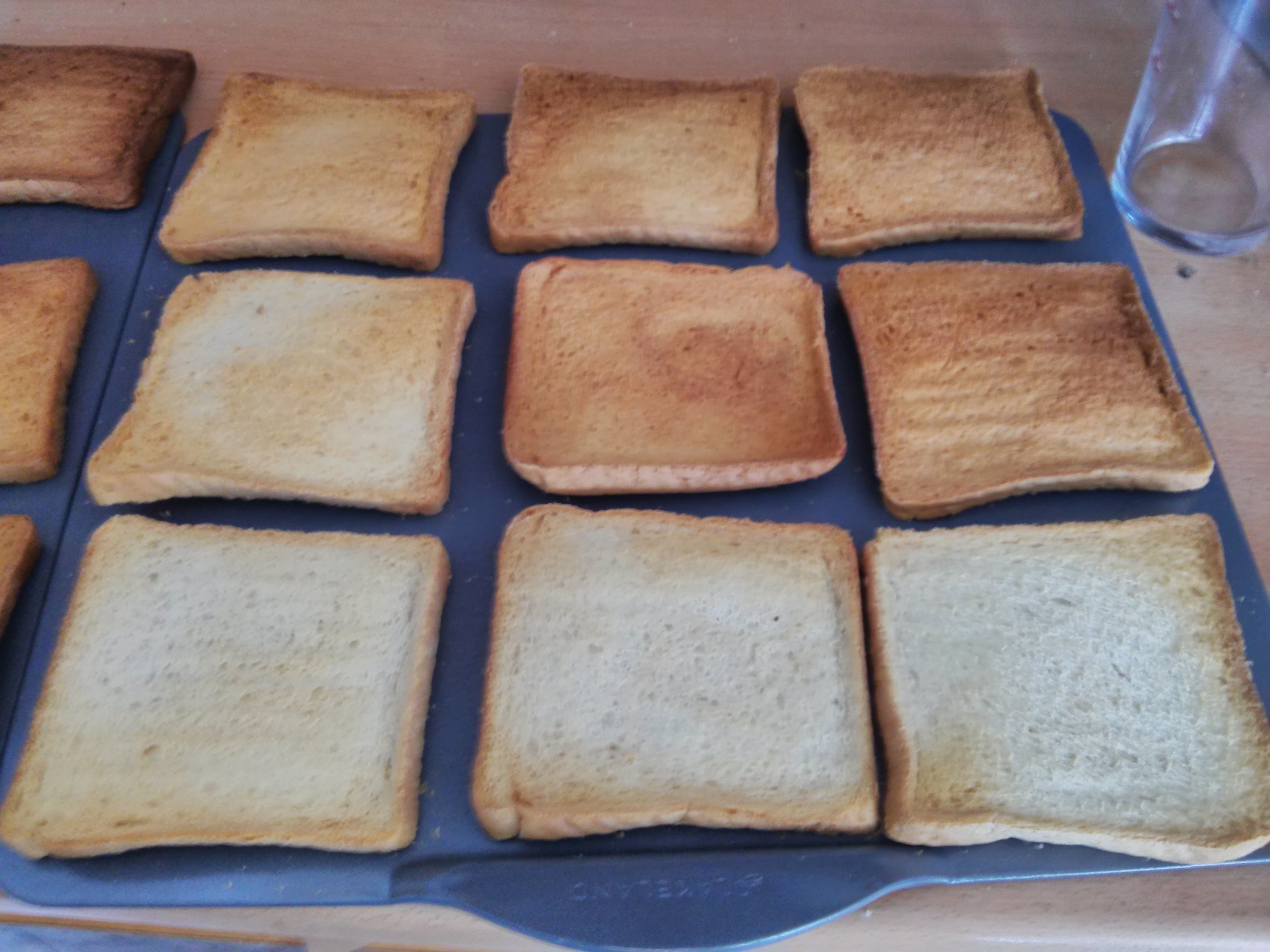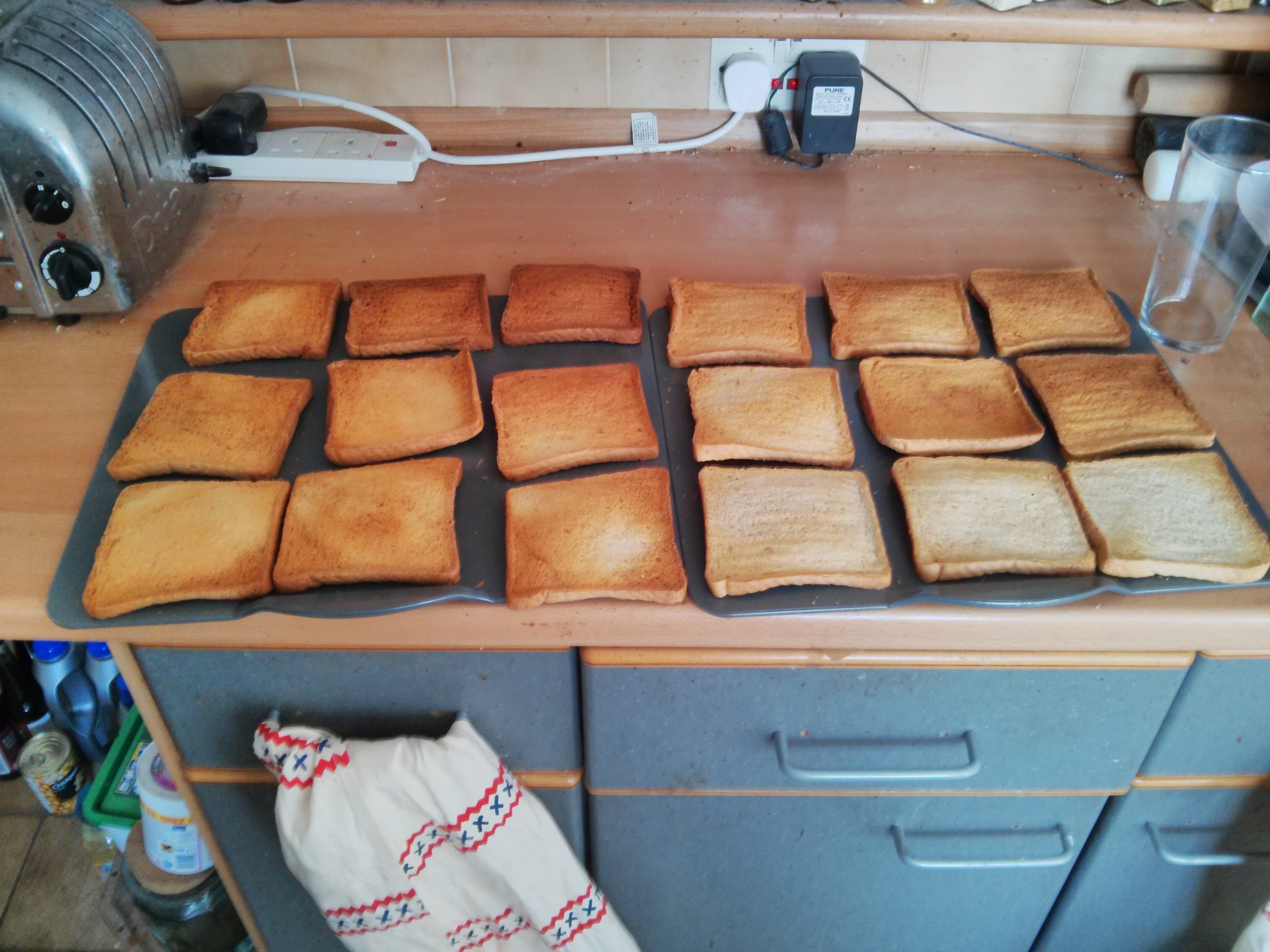 So in this week’s shop there was a rather unusual item: cheap white sliced bread. I put this onto a couple of baking sheets and shoved in the over at 160c fan.