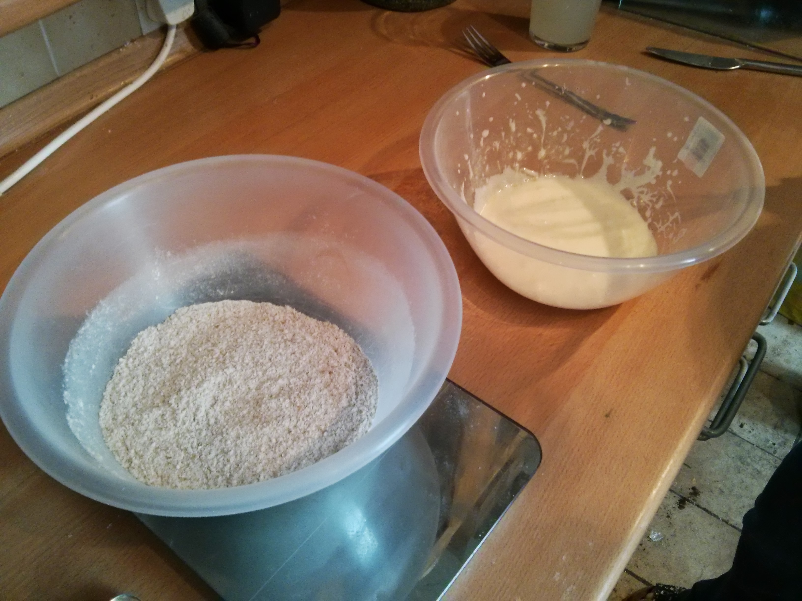 Mixing dry and wet gives you a dough which you split into buns on a lined baking tray.