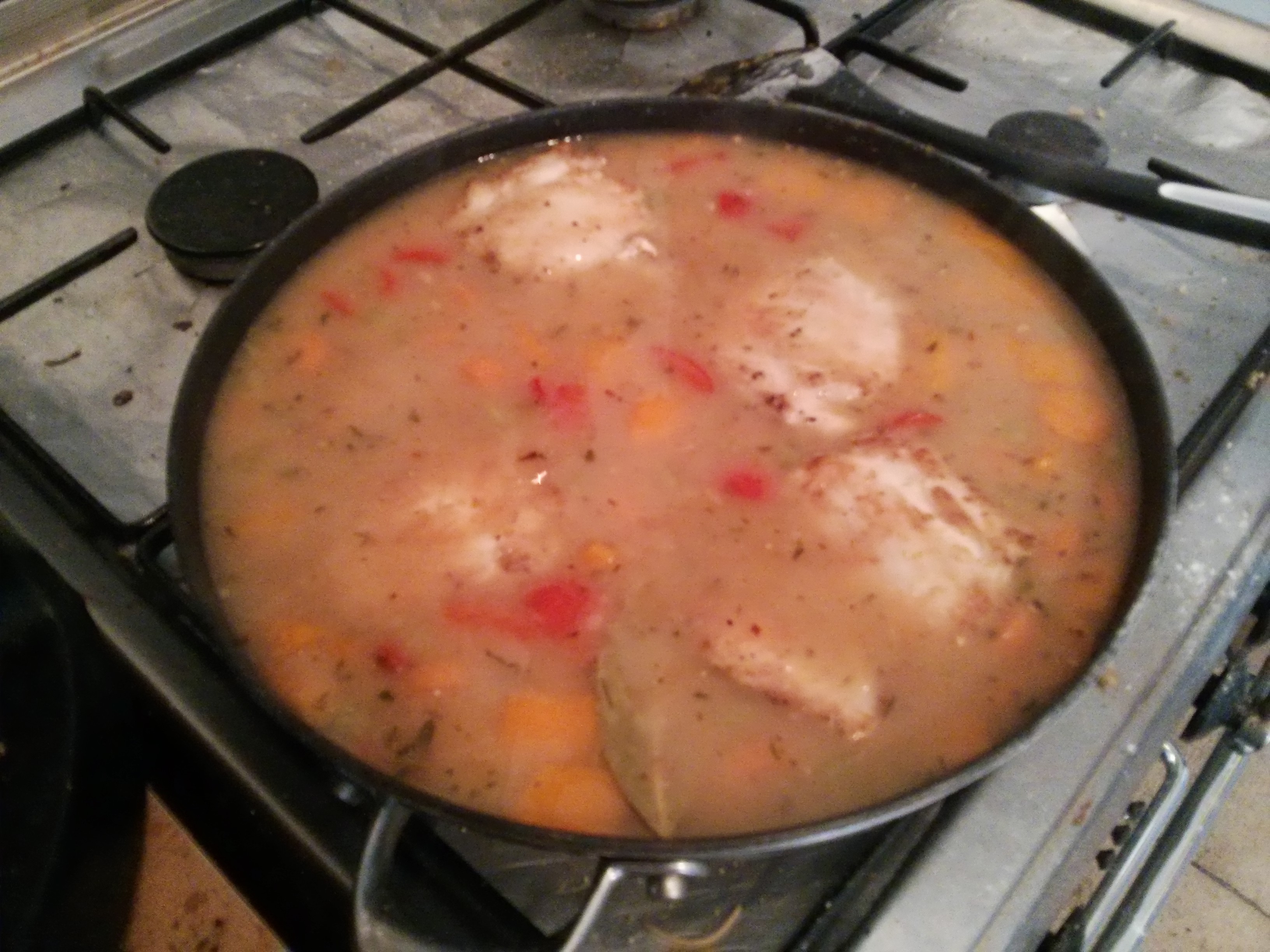 While that fries up you mix stock, dry sherry and the toasted flour, then add that to the pan, then re-add the chicken and simmer until the chicken is poached.