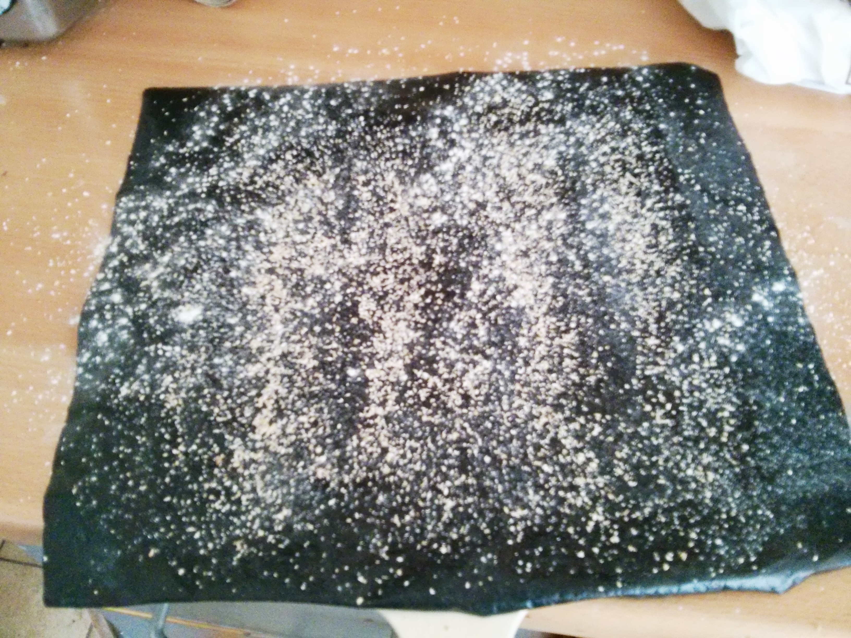 After proving I lined my pizza peel with a silicone sheet, and sprinkled flour and oatbran over it.
