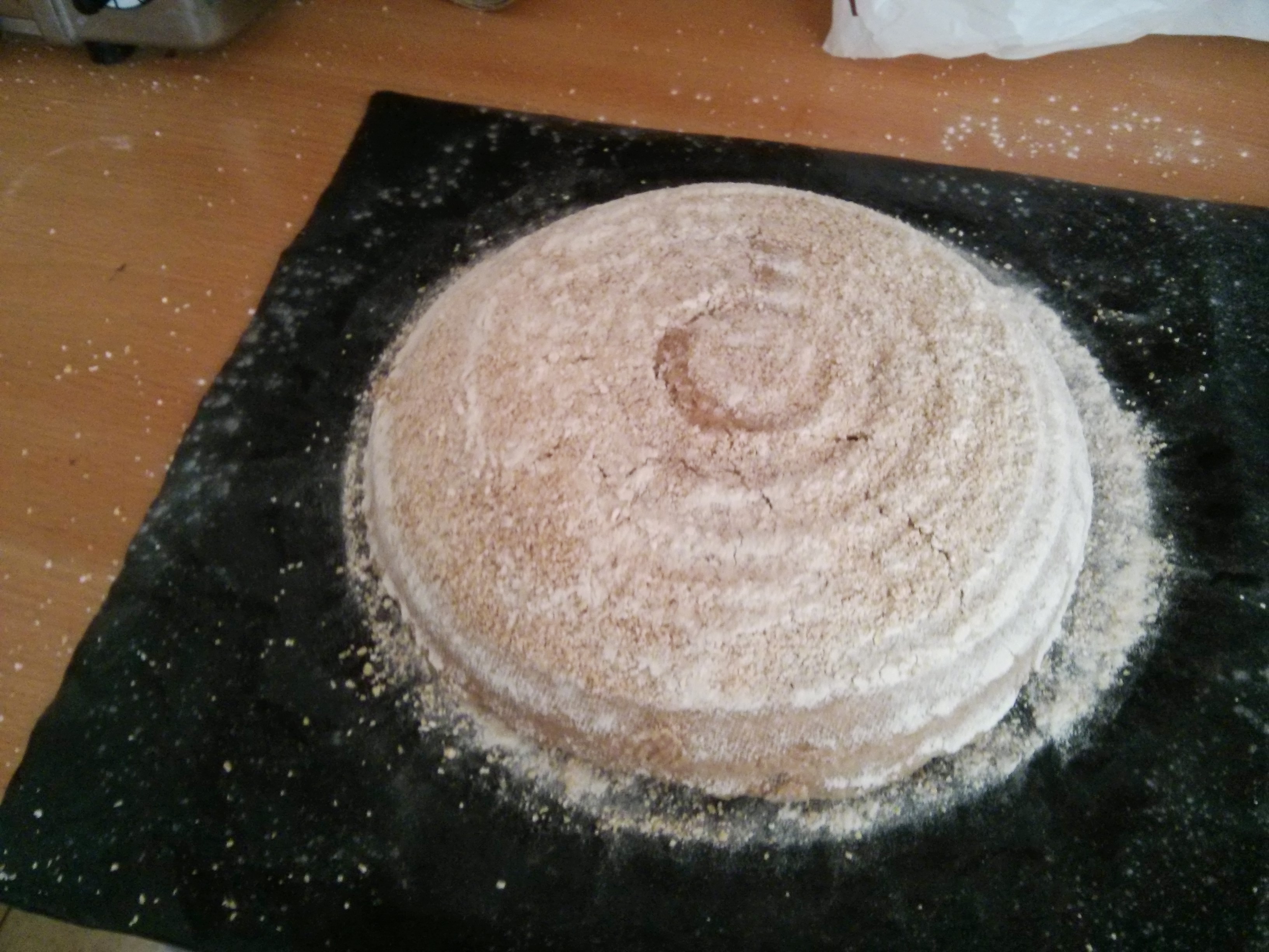 I lined the banneton with flour ad oatbran. The oatbran all fell to the bottom… so hopefully the flour is enough to stop it sticking.