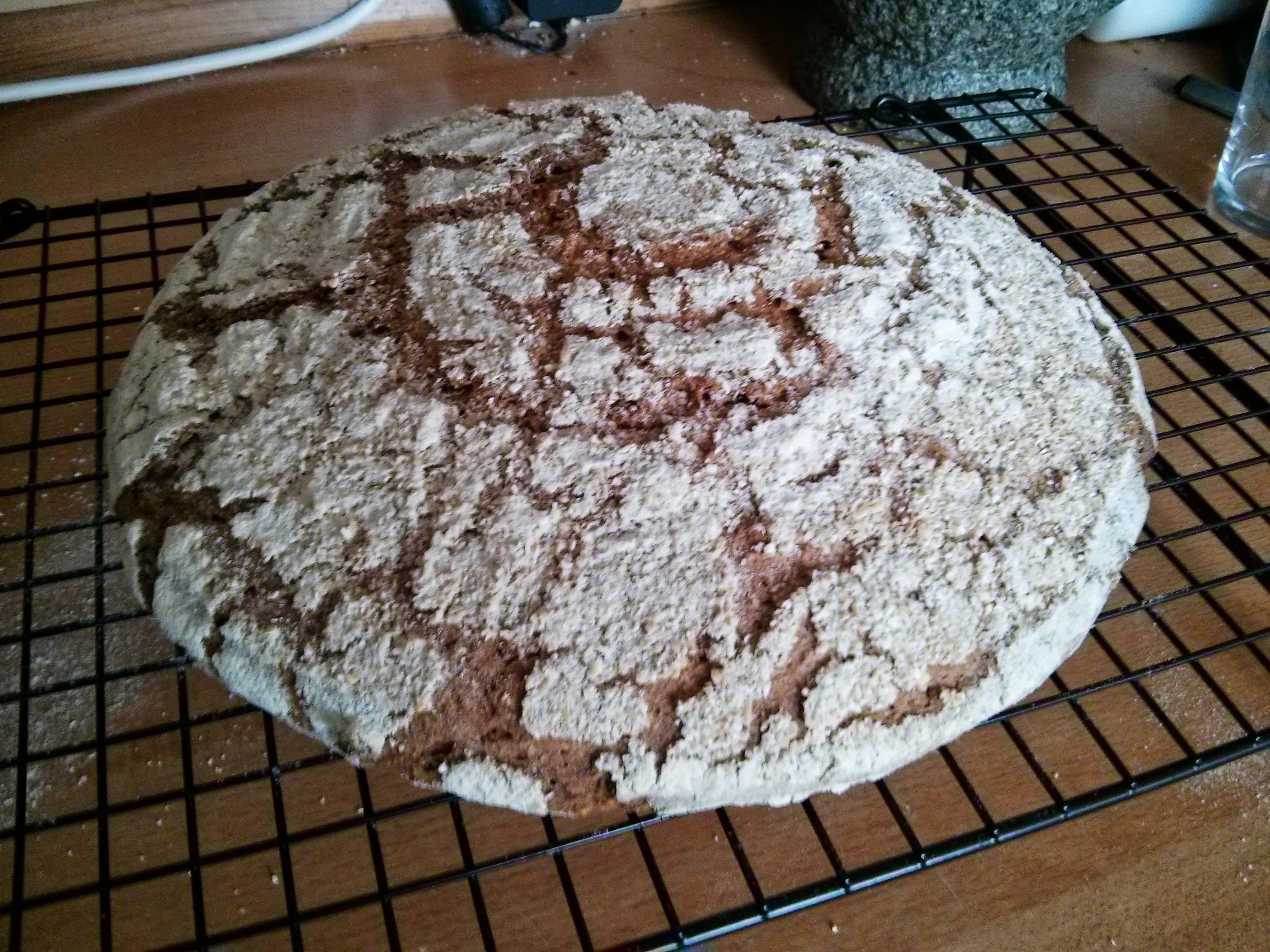 After cooking it looked pretty good. It hadn’t risen as much as I’d like; if there’s no hole inside at the top I may try proving longer next time. Also lots of the oat bran fell off… but I’m really happy with how it looks.