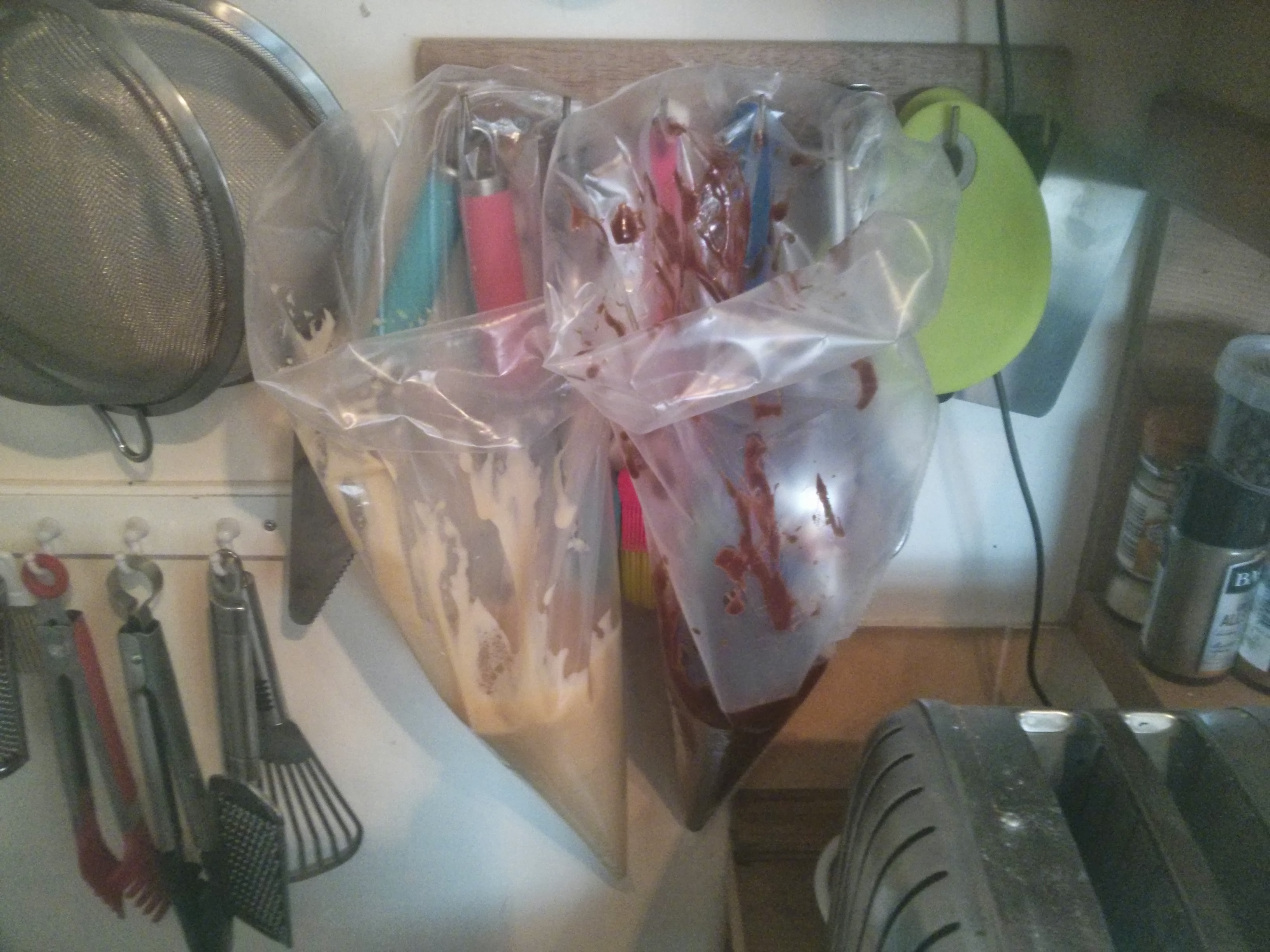 These then go into piping bags. This is tricky… and I ended up hanging them up on utensil hooks!
