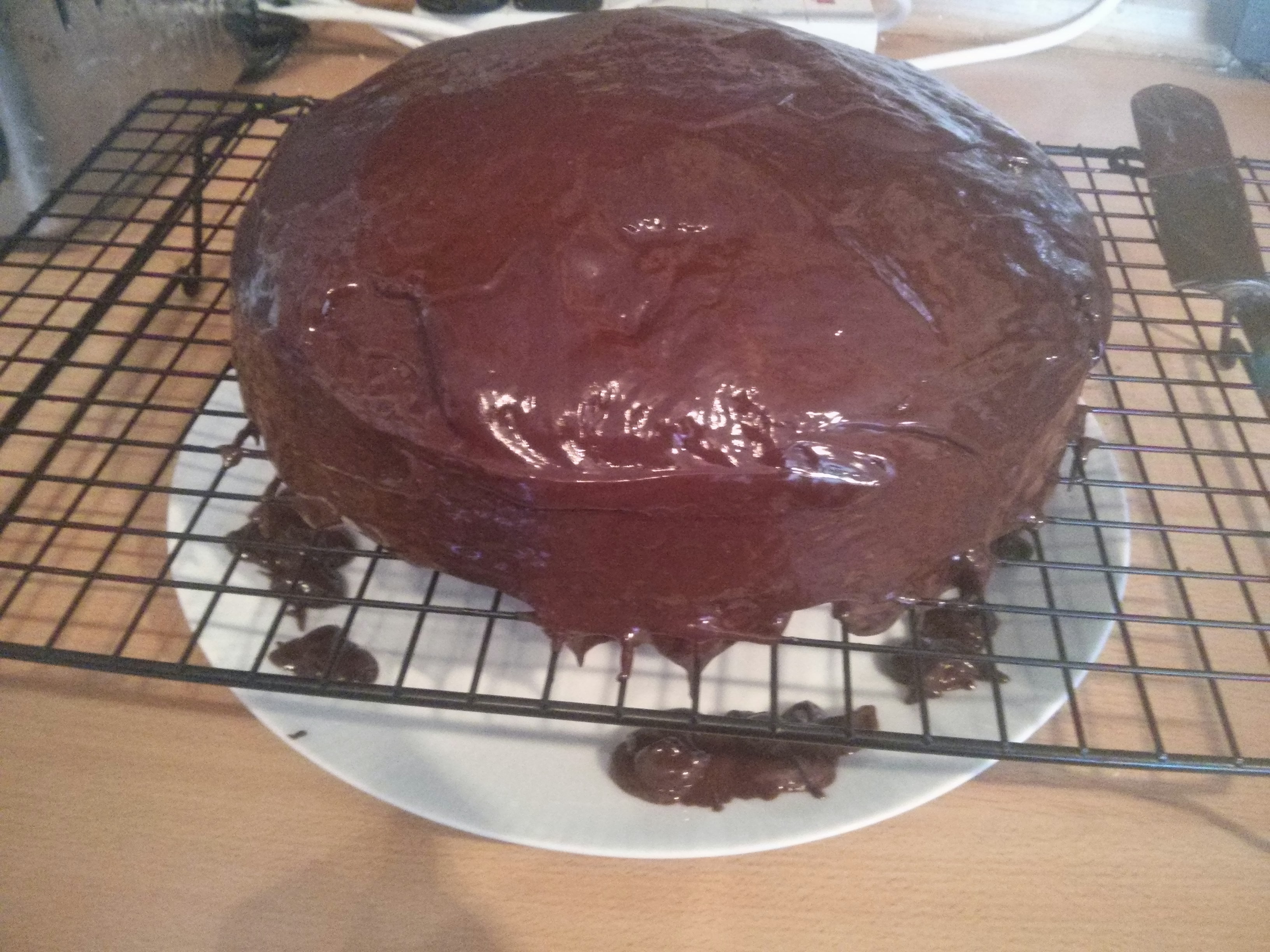 The ganache is basically equal parts dark chocolate and double cream. Heat the cream until it’s about to boil and pour over chopped up chocolate and stir in. This then gets poured and smoothed over the cake.