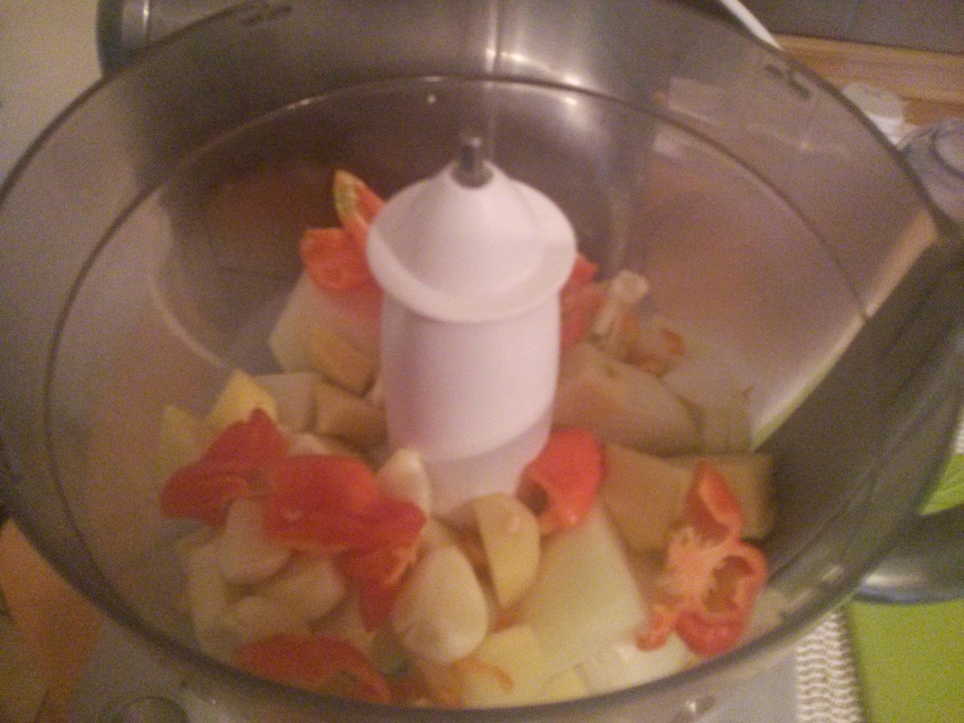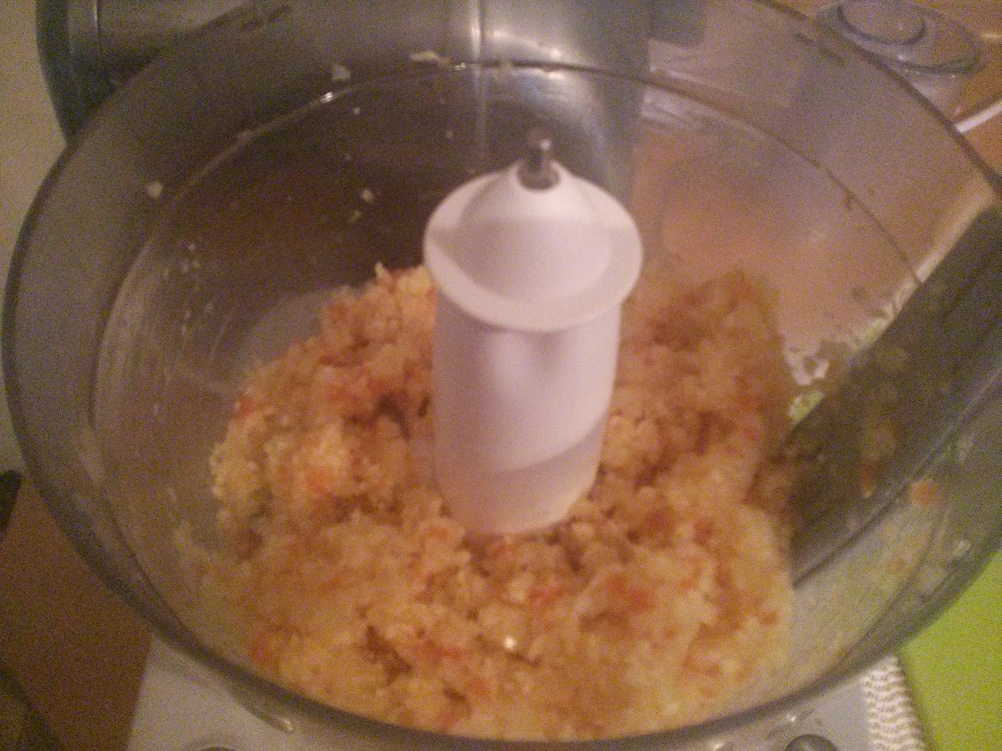 It all starts off by making a paste of onion, scotch bonnet (habanero) chillies, garlic & ginger in the food processor.