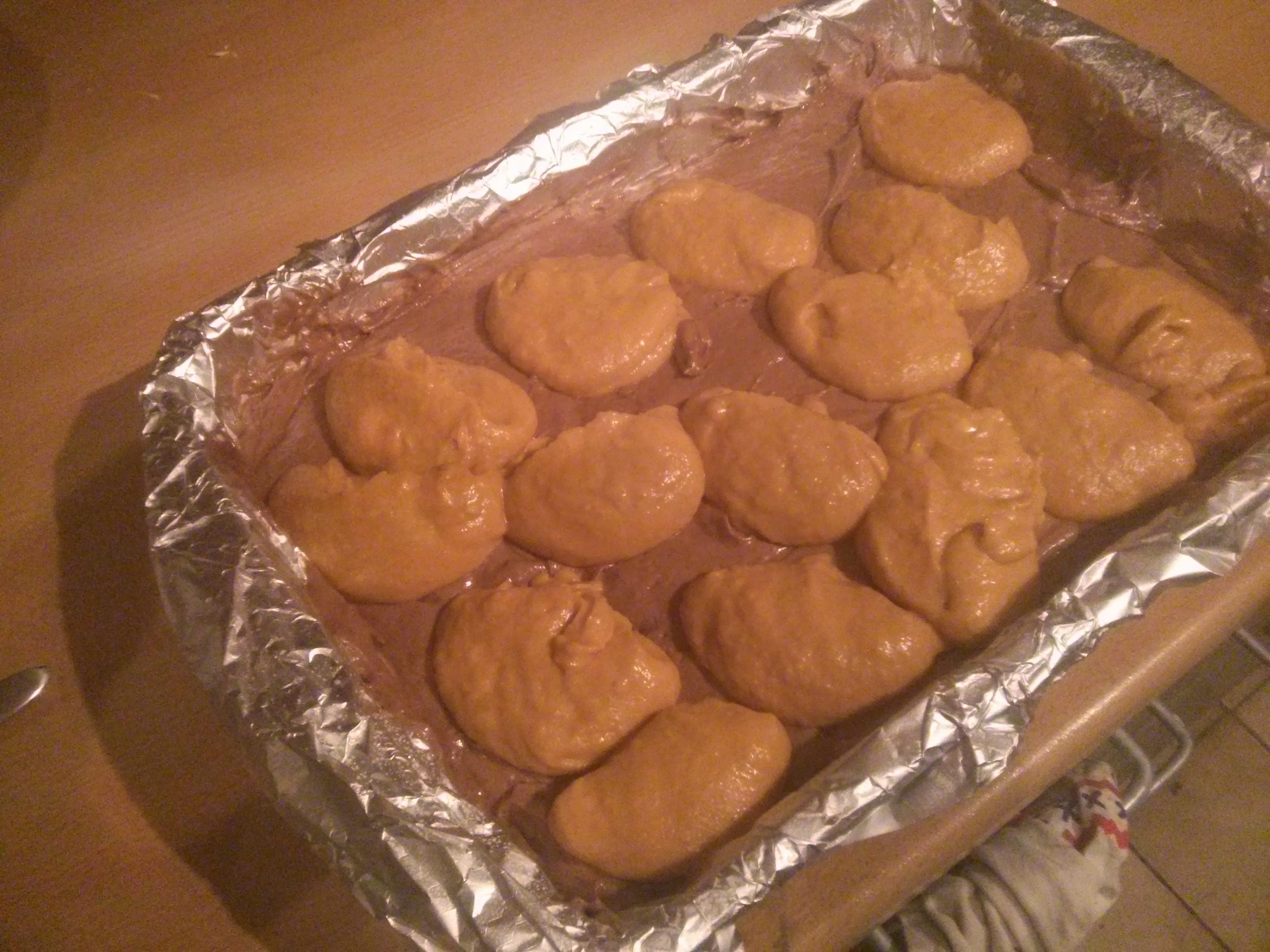 The chocolate mix goes into a large foil-lined tin, then the pumpkin mix is dolloped on top.