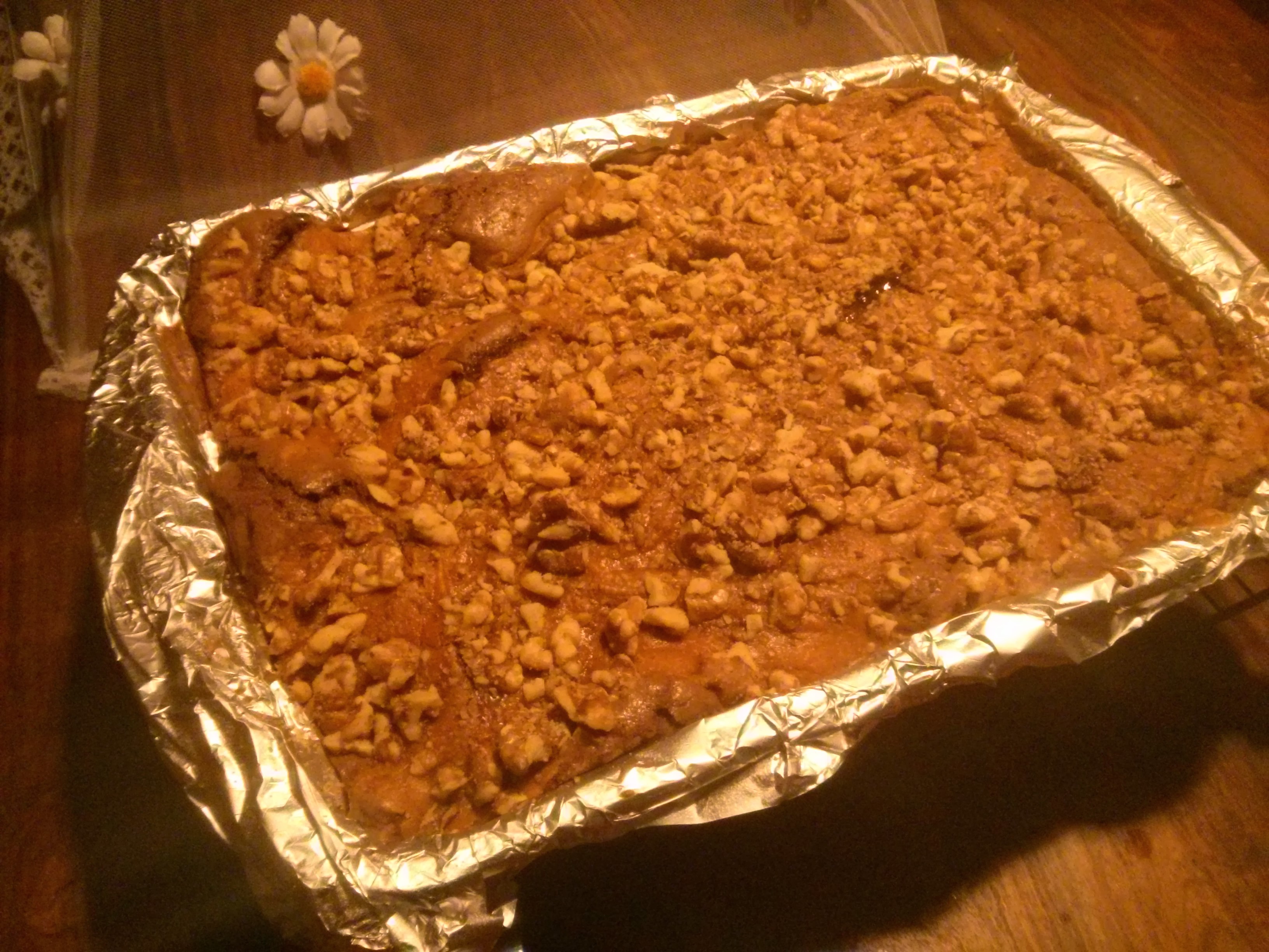 As you can see there’s way too much pumpkin mix for a marbling effect. By the time I’d done some swirls with a knife it was basically a layer of pumpkin on top. Not the worst thing in the world given how yummy it is! Then it gets scattered with walnut bits: once again the recipe says to use way too many, but I’d already crushed them up, and I like walnuts, so on they go!