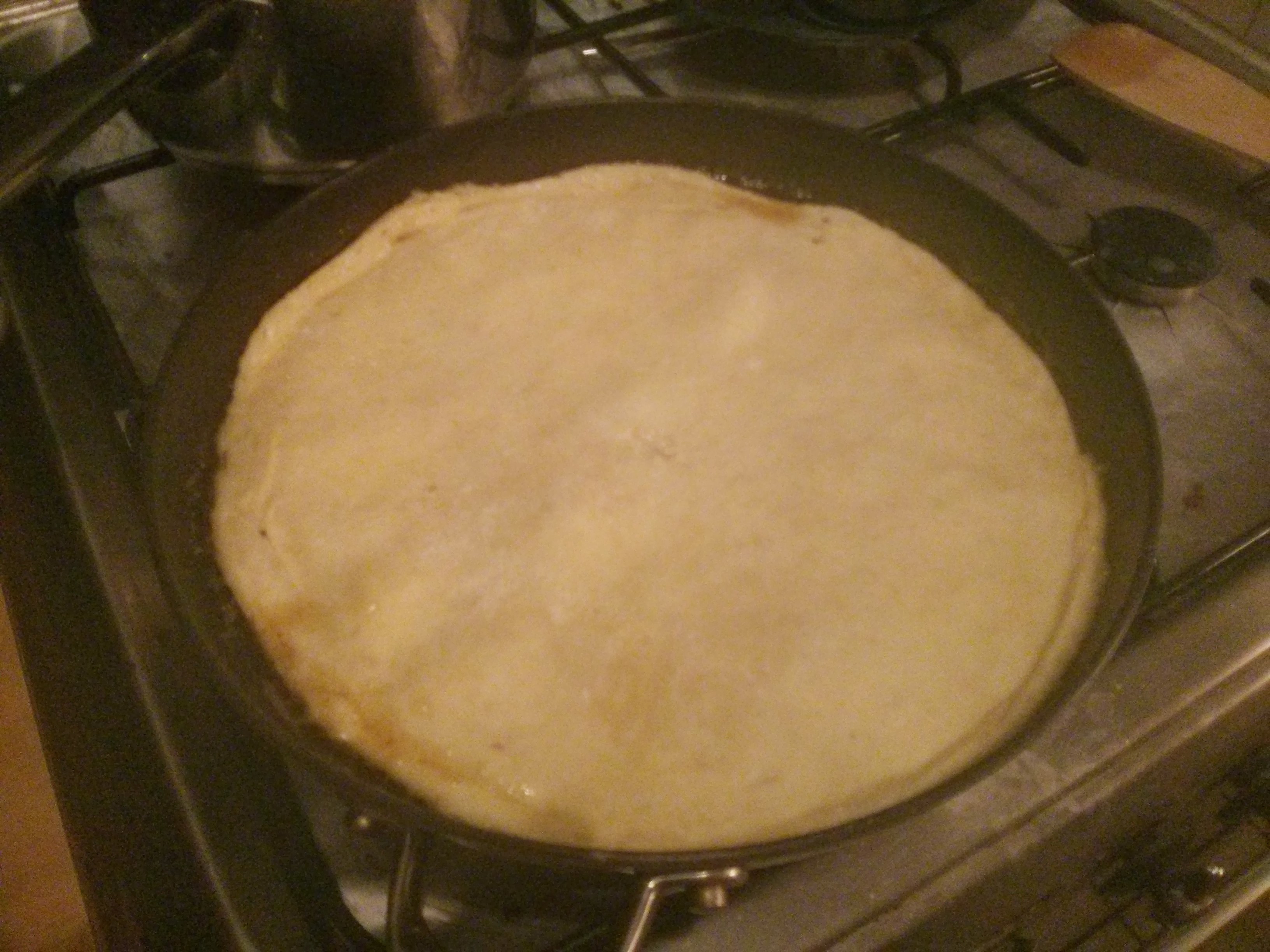 Then roll out the pastry and cut out a circle to fit the pan, and tuck in at the edges.