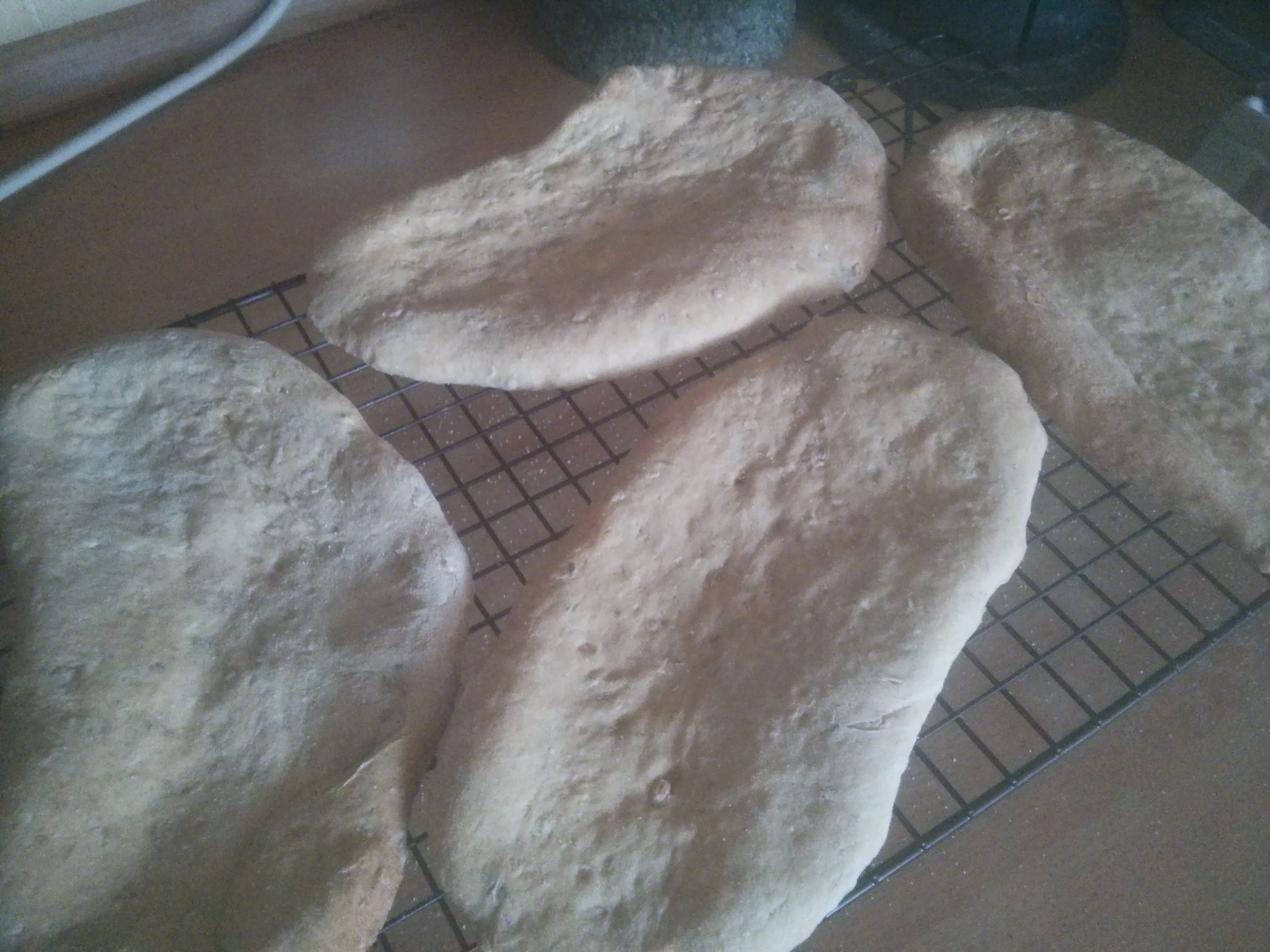 They didn’t puff up in the oven like pita breads do, possibly due to the extra chickpeas in the dough, or not rising properly. After 10 minutes they didn’t look done, so I gave then another 5 minutes and then they looked good (although as I hadn’t rotated during cooking the one at the back right had a lot more colour than the ones at the front…).