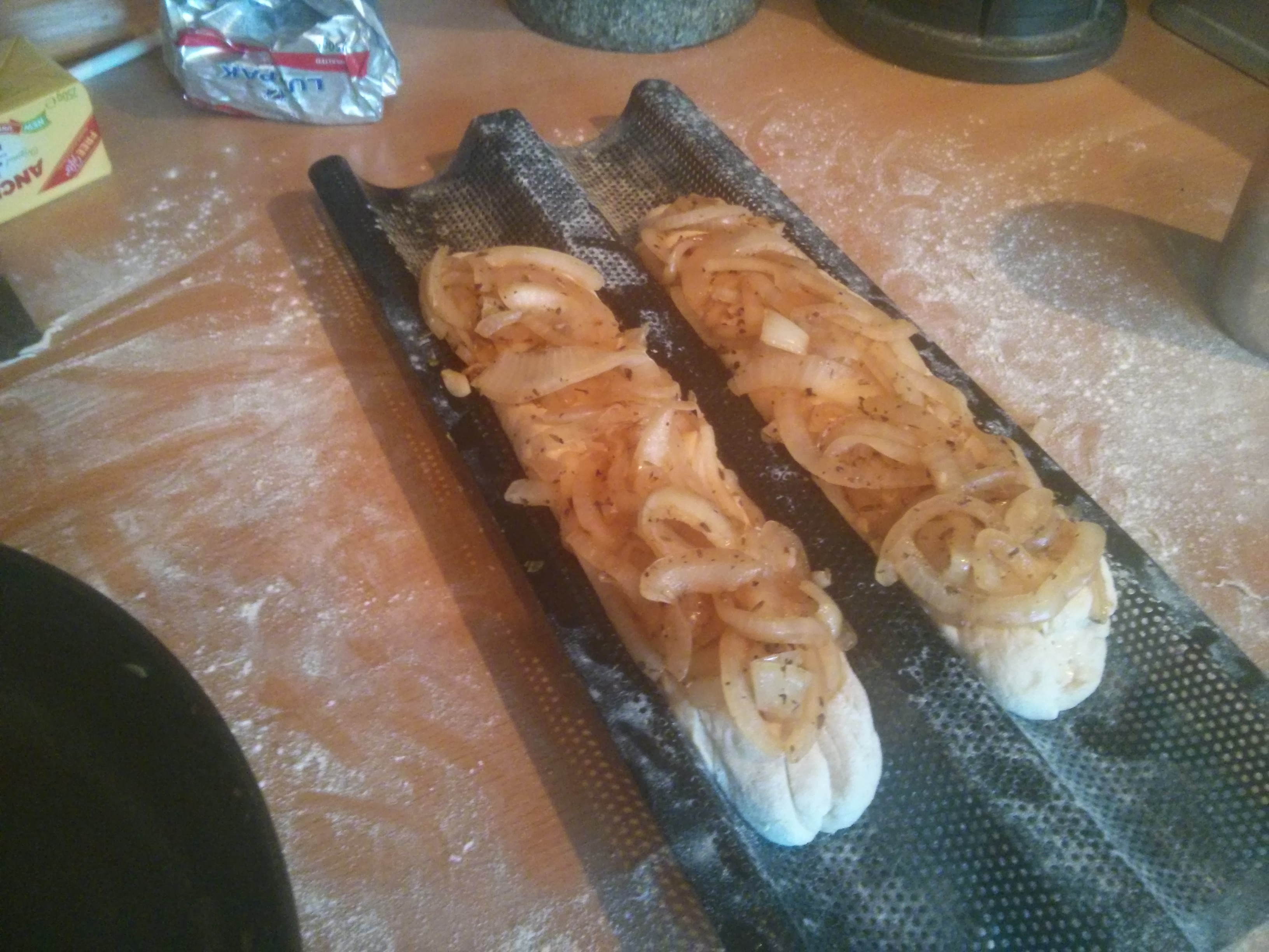 To go with our meatballs in marinara sauce tonight, I’m doing onion topped baguettes, from a Jamie Oliver book I found at the library, although I’m using the same Paul Hollywood recipe I used before for the actual baguette dough.