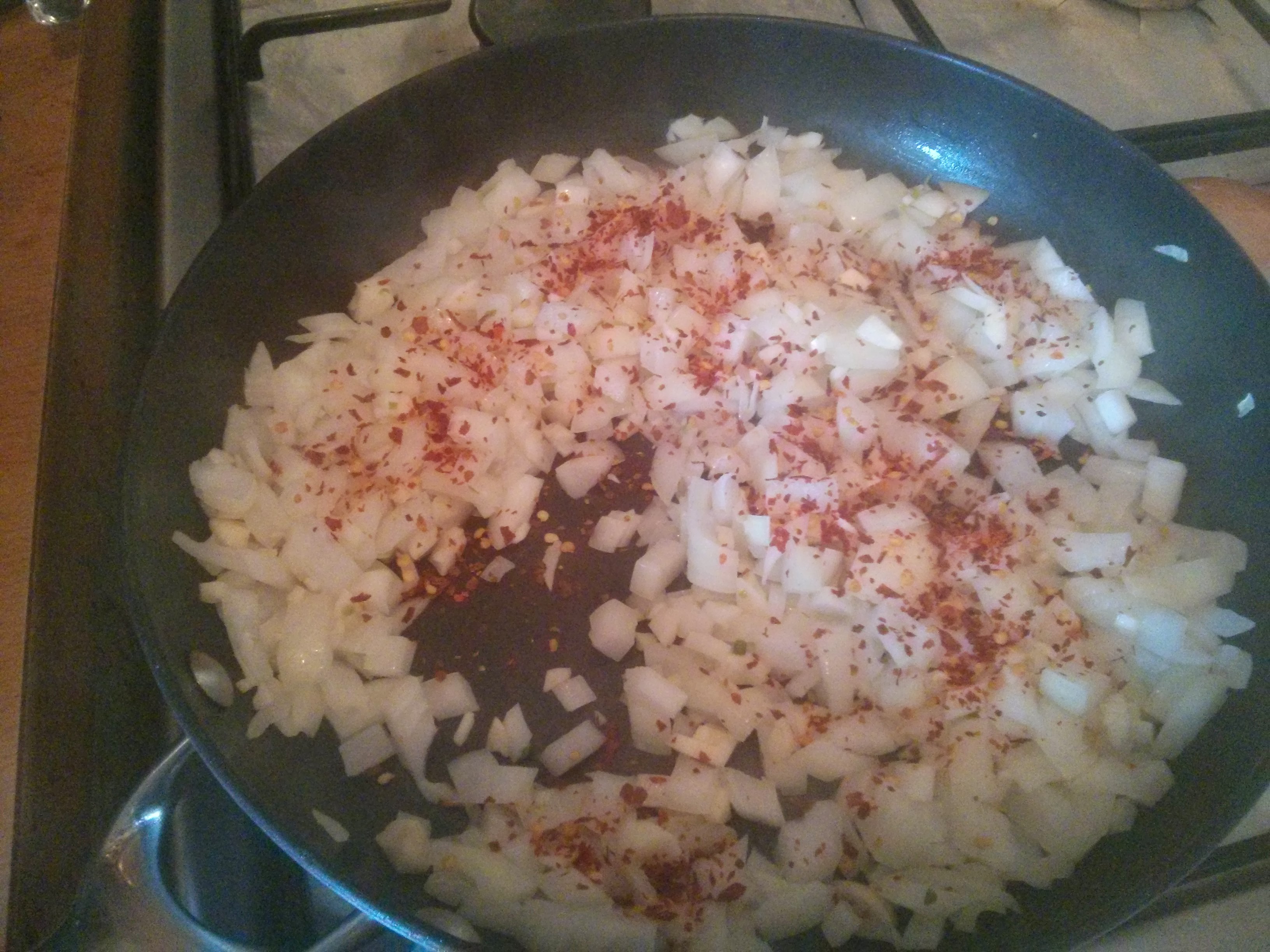 This only takes a couple of minutes to cook, and it gets served with the meatballs on top and the onion baguette bread I made earlier.