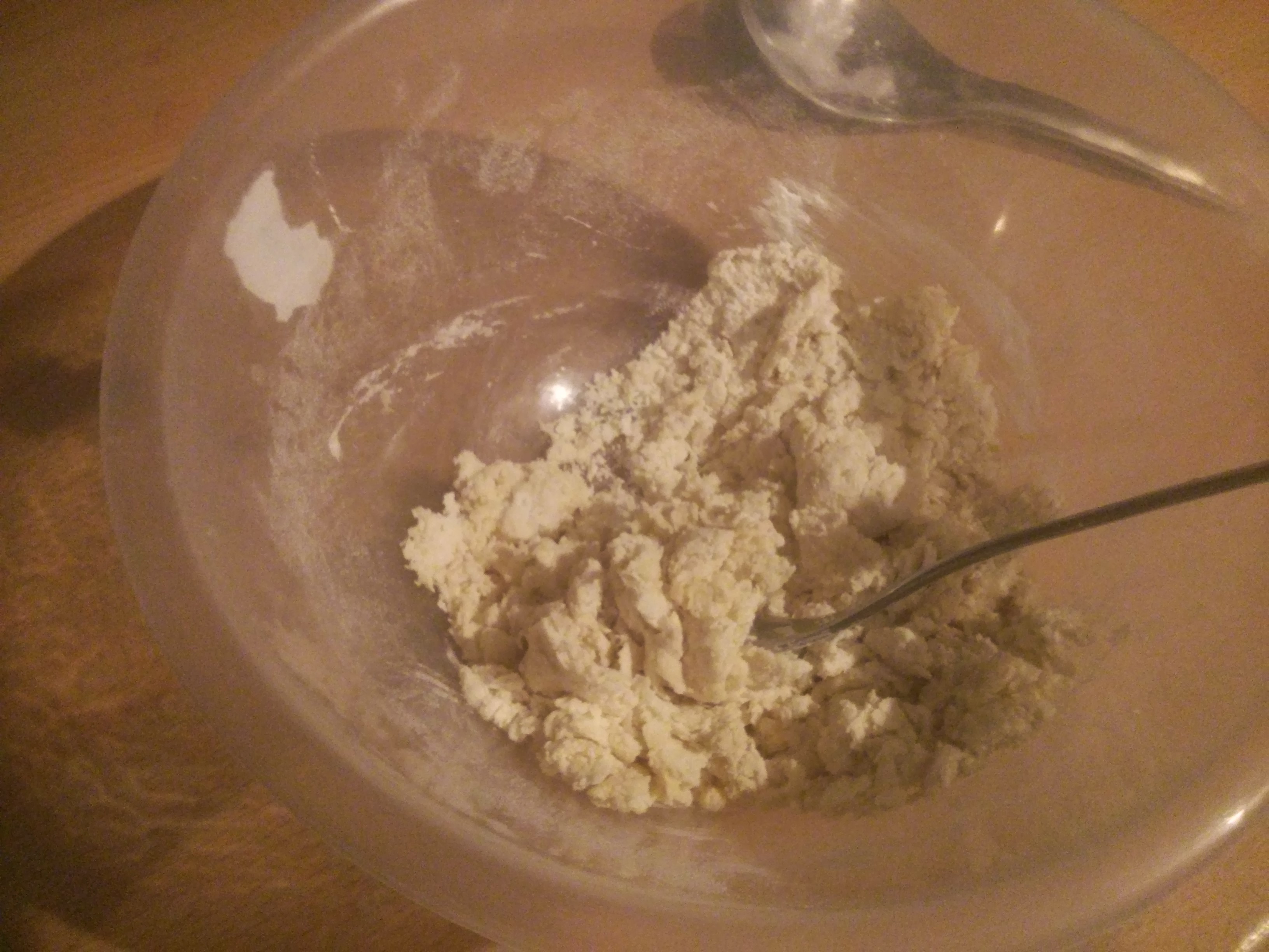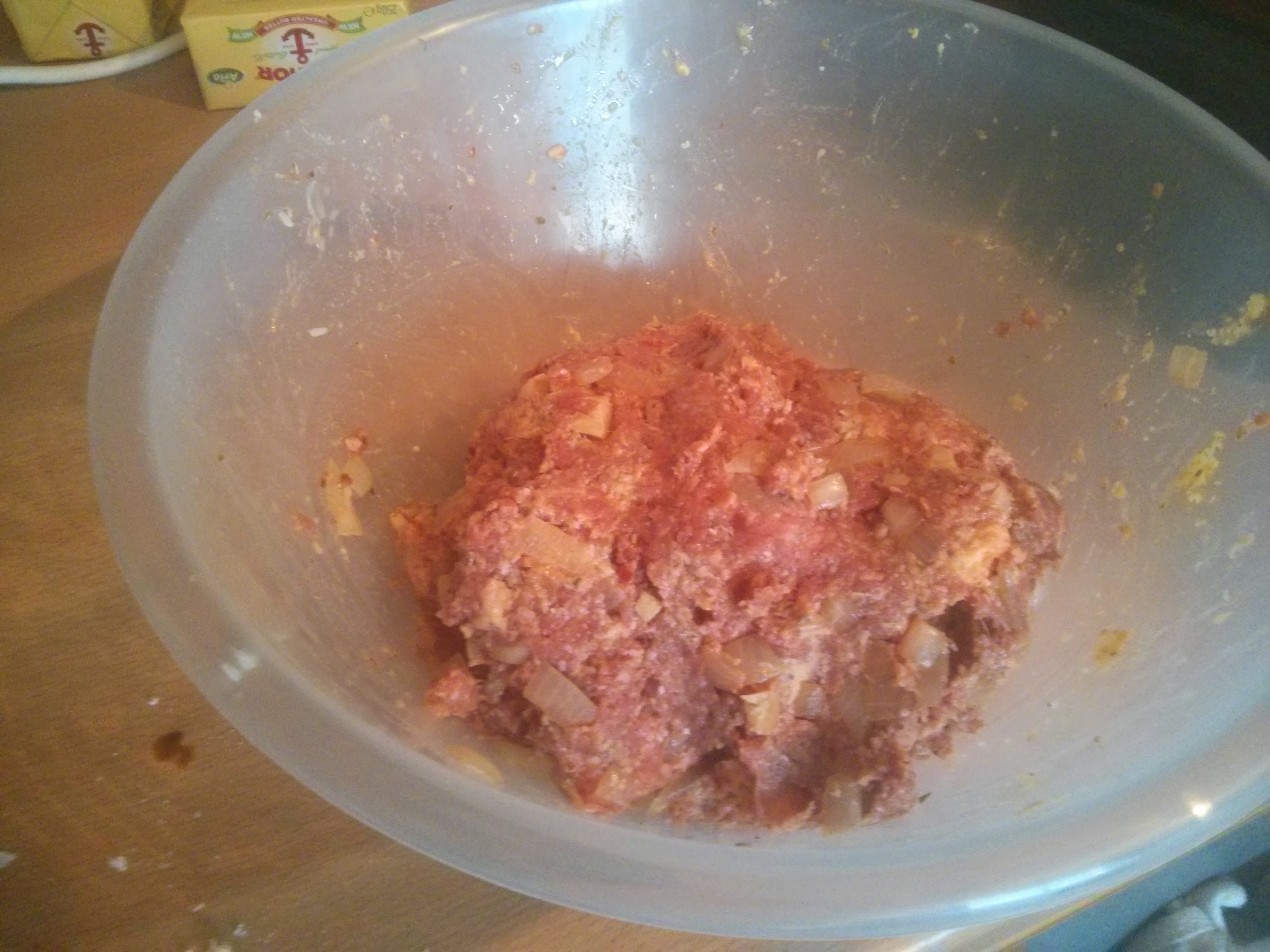The set aside onions then have the bread and milk added to them, and get forked to form a paste. At this point it’s clear the onions are cut rather large for this: I should have done them much finer.