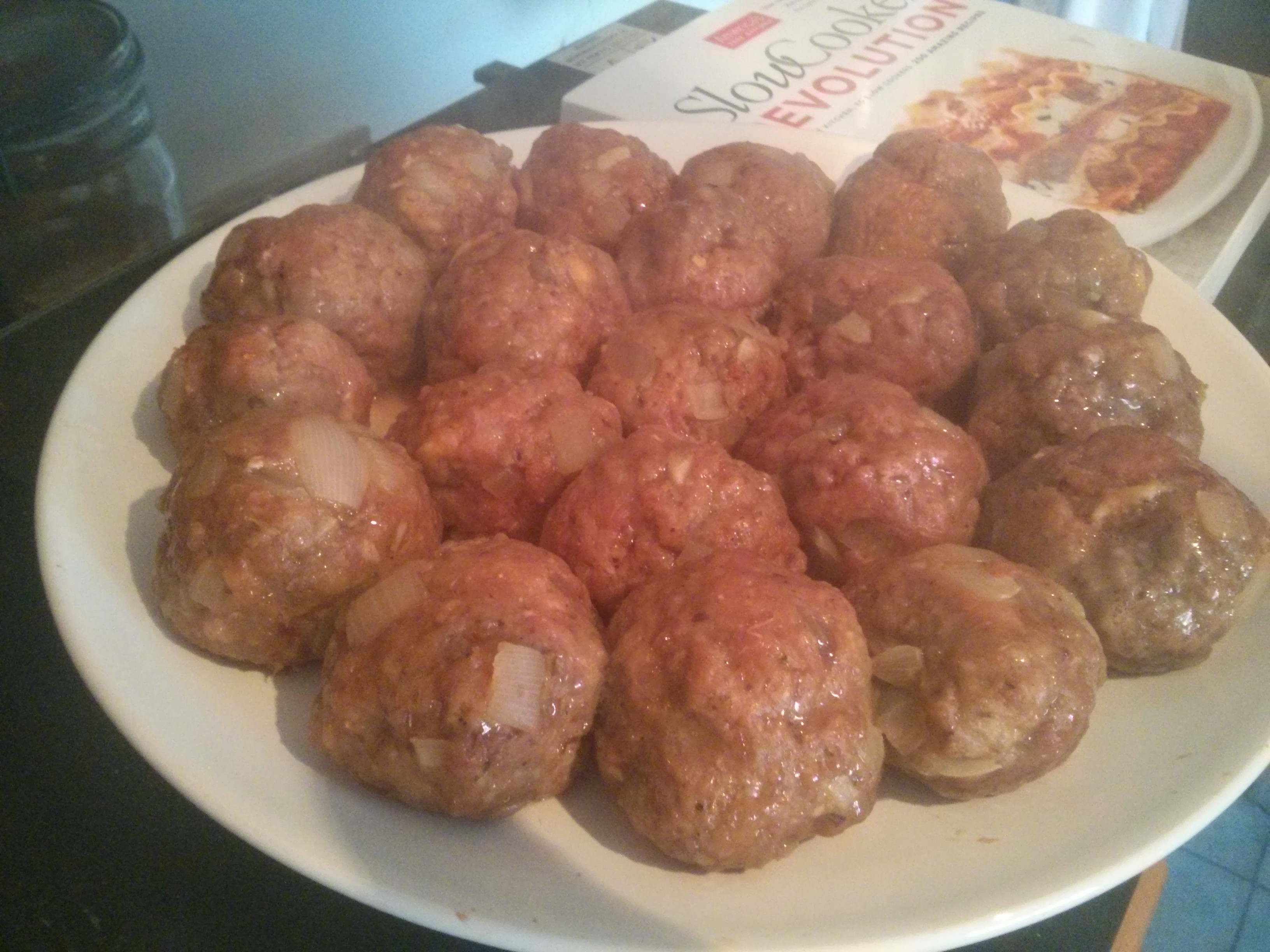 Meatballs are probably an odd thing to do in the slow cooker, but we’ve been hearing a lot about marinara sauce, and the slow cooker is still new and has novelty value: so meatballs in marinara it is! Base recipe was from America’s Test Kitchen’s Slow Cooker Revolution.