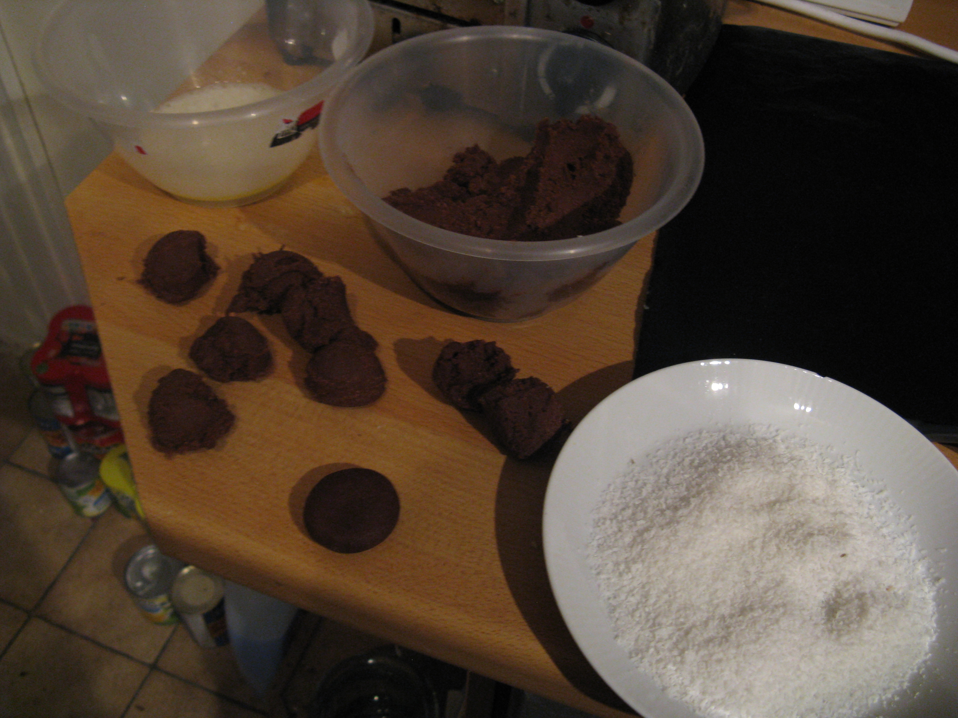 The dough gets chilled, then formed into 1 tbsp balls and flattened. These get dipped in whisked egg white and coated top and sides with desiccated coconut.