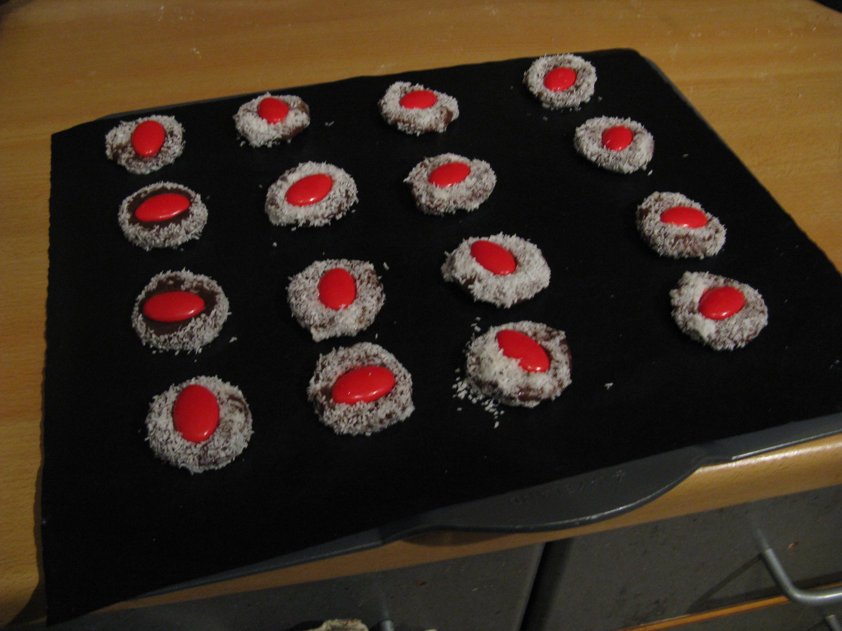 Whisk egg whites. Take 1 tbsp portions of dough and roll into ball, then flatten. Dip in egg whites then in coconut, covering top and sides. Place on lined baking tray. Top with huge red chocolate button.