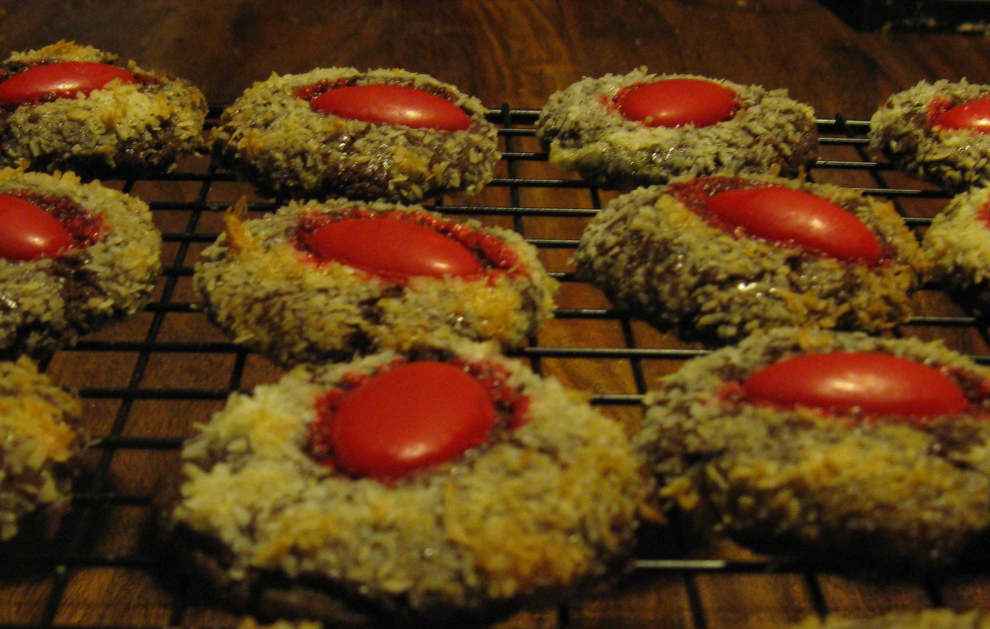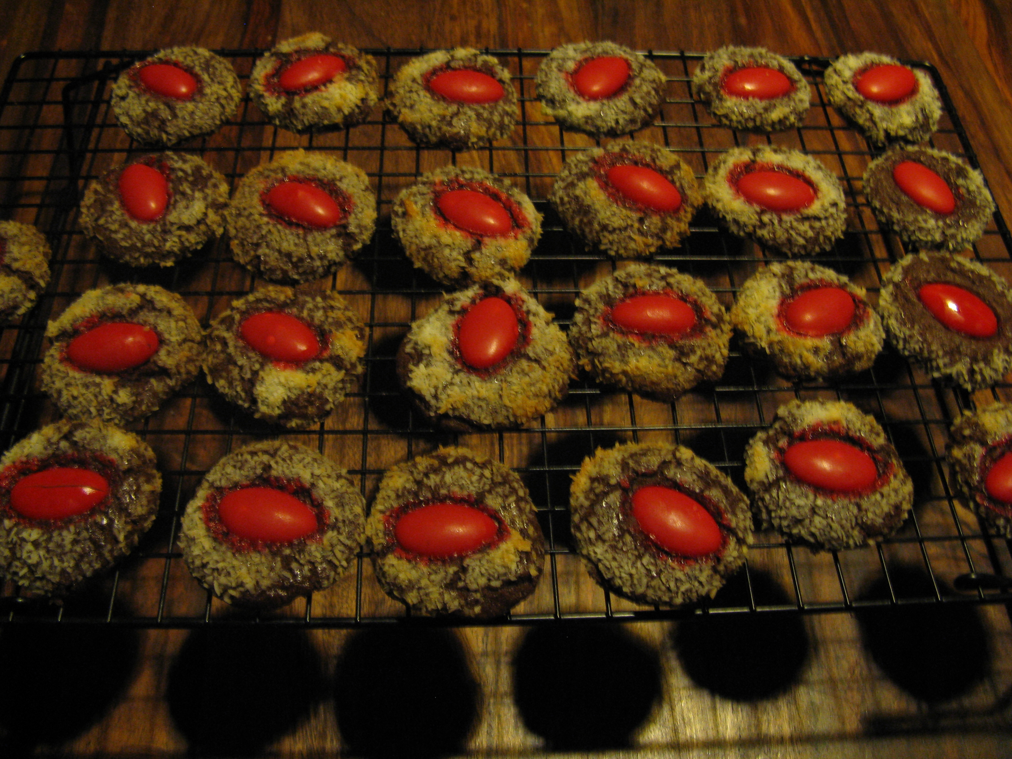 They taste really good! The huge red chocolate buttons were really brittle before cooking, but after then had softened a bit, so they worked well as a topping and added a nice extra hit of chocolate to the cocoa based cookie. The red colour seems to have leaked a bit into the coconut… but it’s not the end of the world!