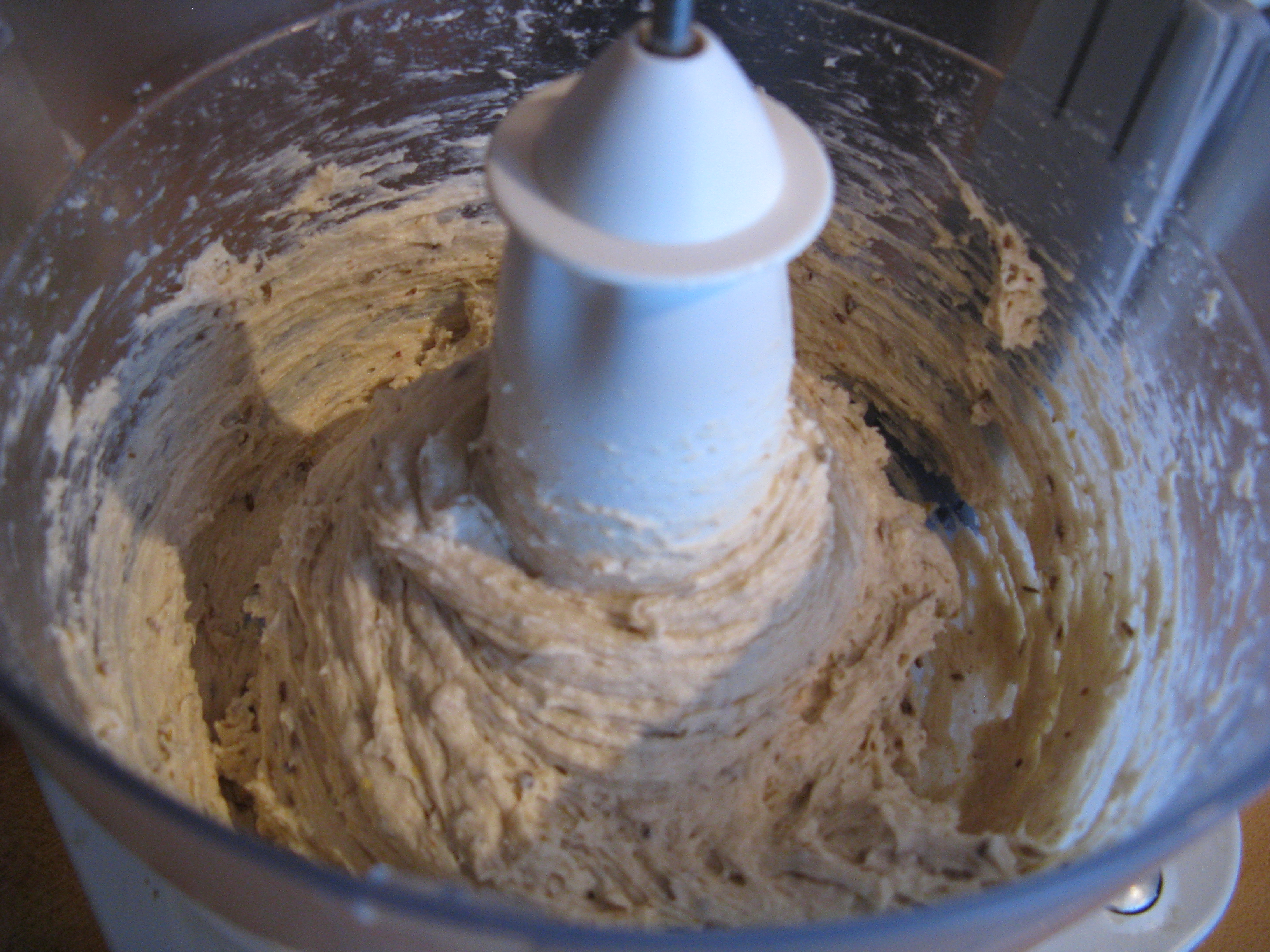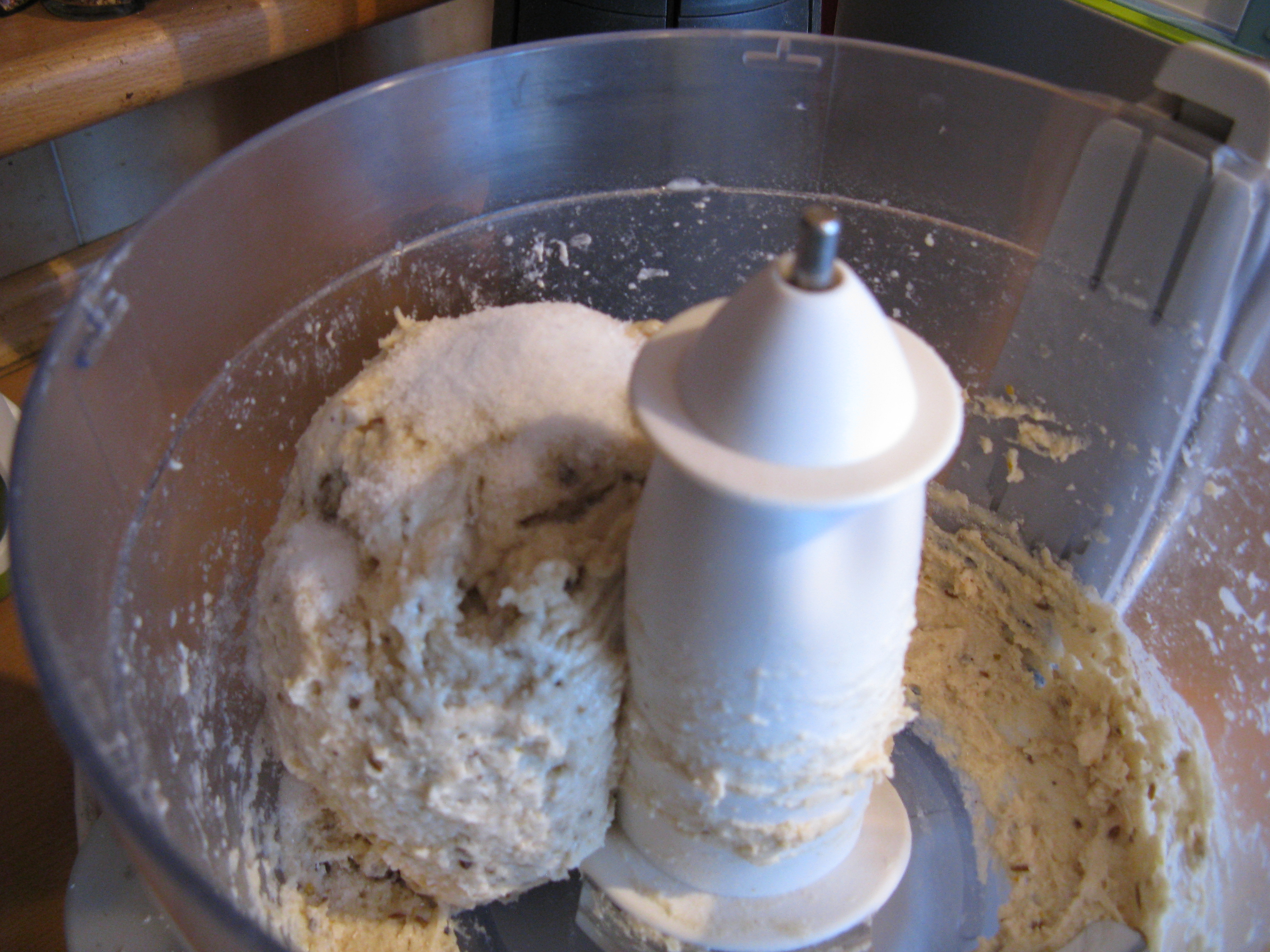 I didn’t realize this had happened and added flour to bring the dough together, when really all it needed was the blade moving at the proper speed and all the mix staying in the bowl…