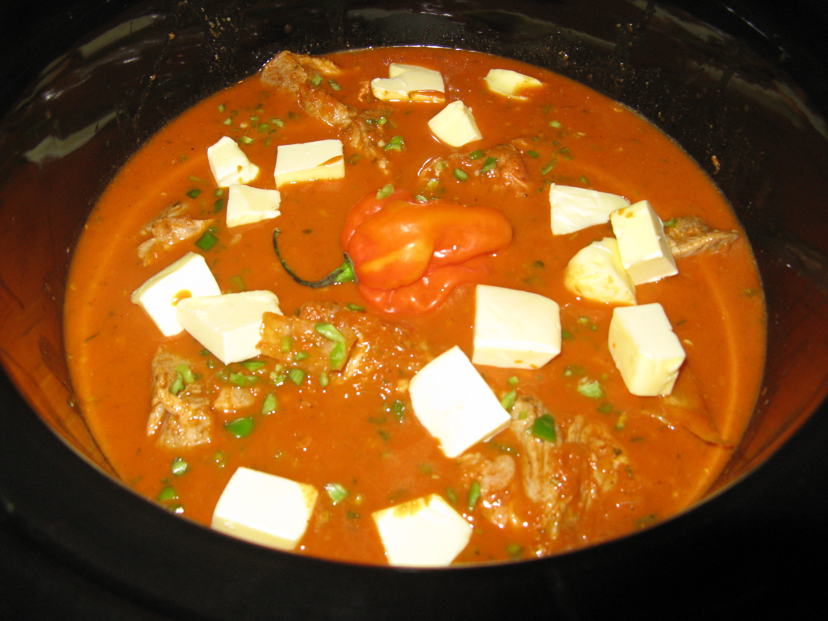 In the morning add pork and marinade to slow cooker, add butter and chillies.