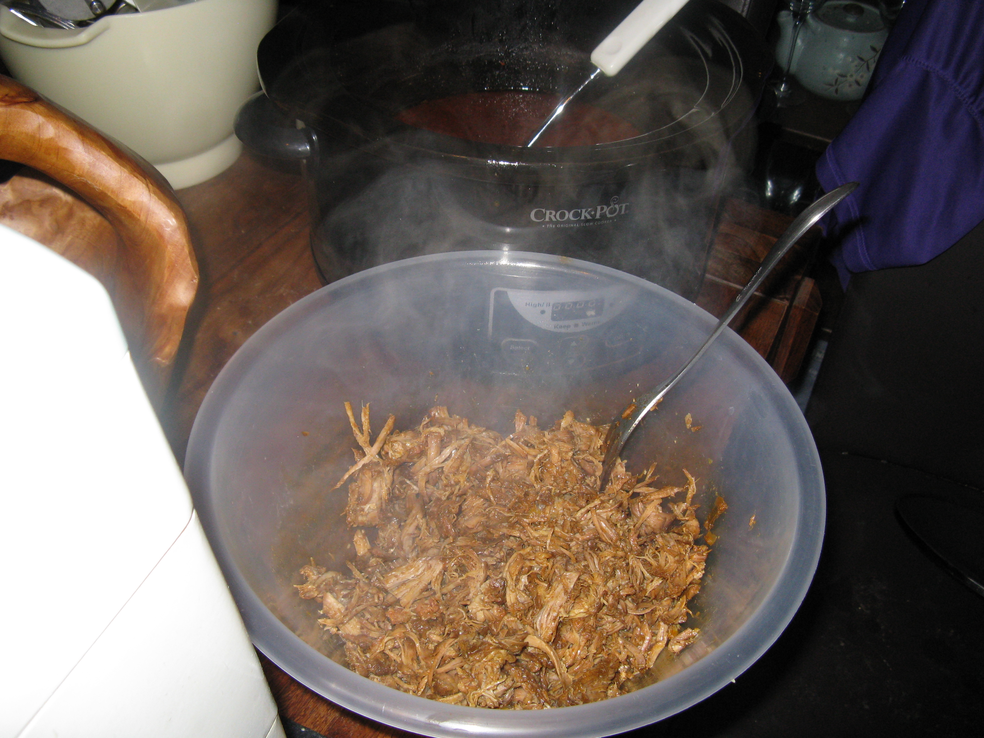 We had some problems getting all the ingredients. We couldn’t find pork neck, and when I checked what Slow Cooker Revolution uses for pulled pork they wanted pork butt, which I couldn’t find either. Then I found out that what Americans call pork butt is actually shoulder… does that mean getting kicked in the butt means getting kicked in the shoulder? Anyway, I found I could get pork shoulder.