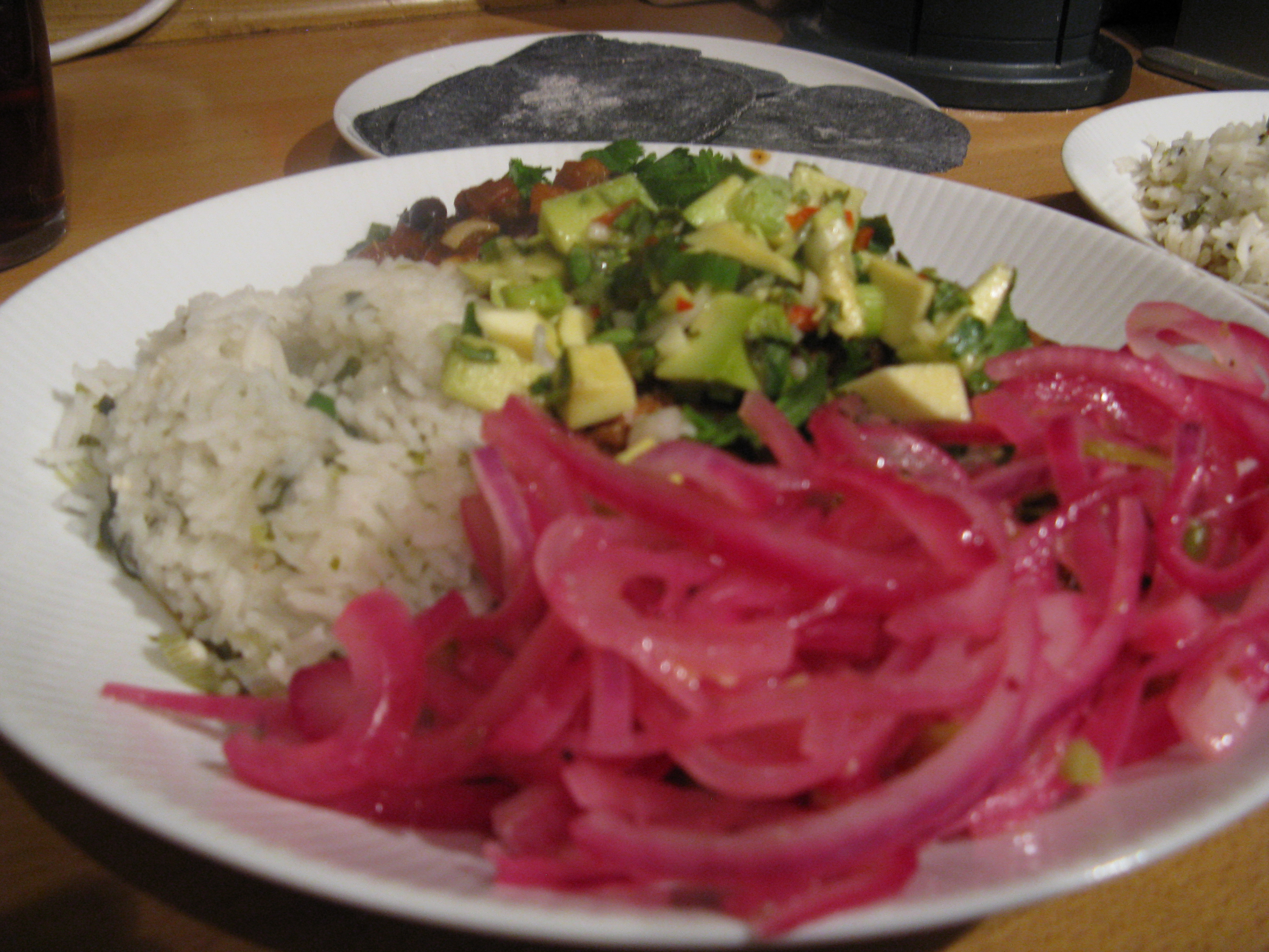 Then we add guacamole (avocados, lime juice, chilli, coriander, salt & pepper), pink onions (red onions pickled for a few hours in lime & orange juice, coriander, scotch bonnet, salt & pepper), black beans (black beans, tinned tomatoes, onions, carrots, celery, allspice, cumin, coriander, beef stock, thyme, oregano, chioptle powder), green rice (basmati rice, boiled in water with chopped coriander), and the blue tortillas.