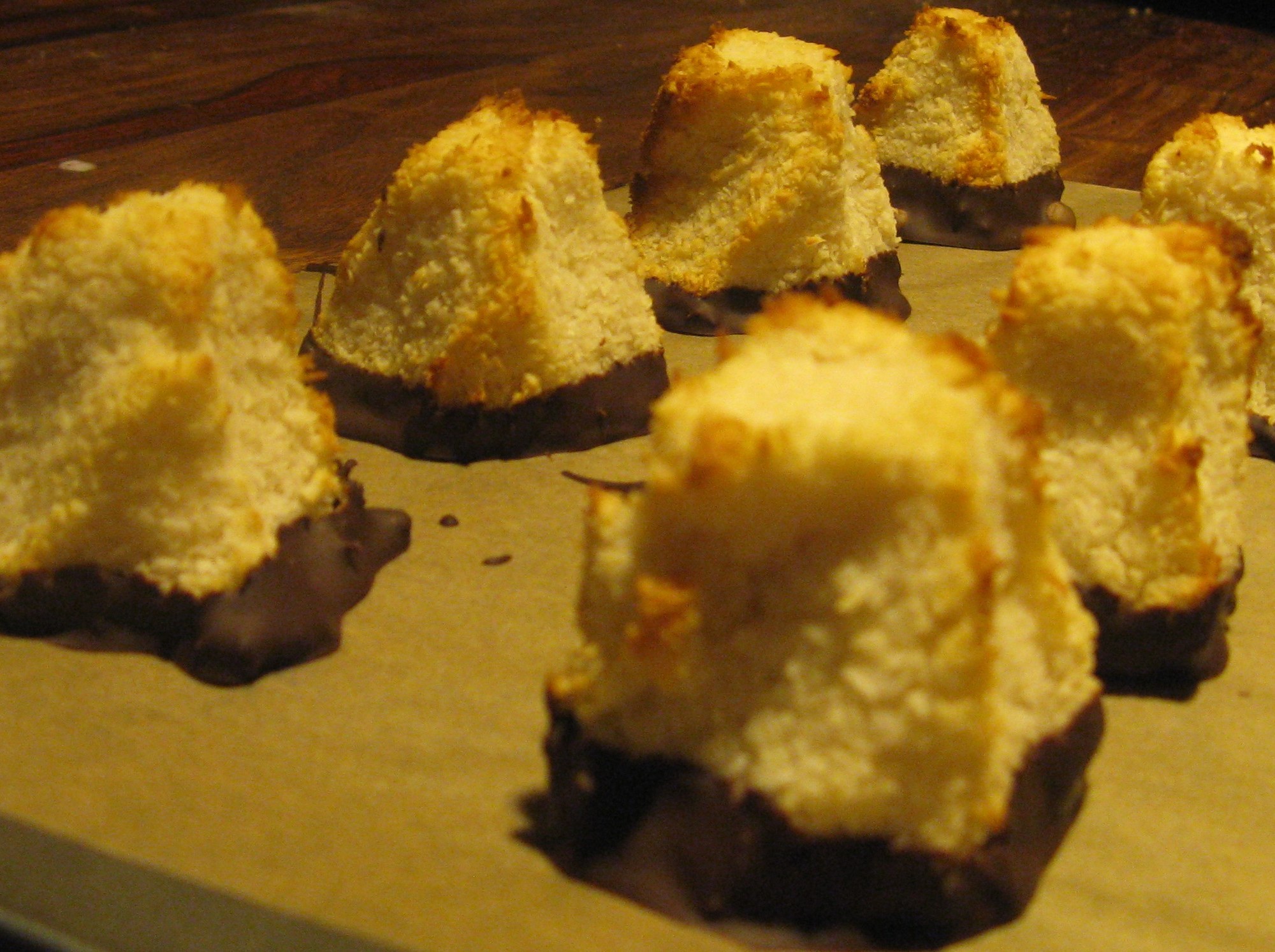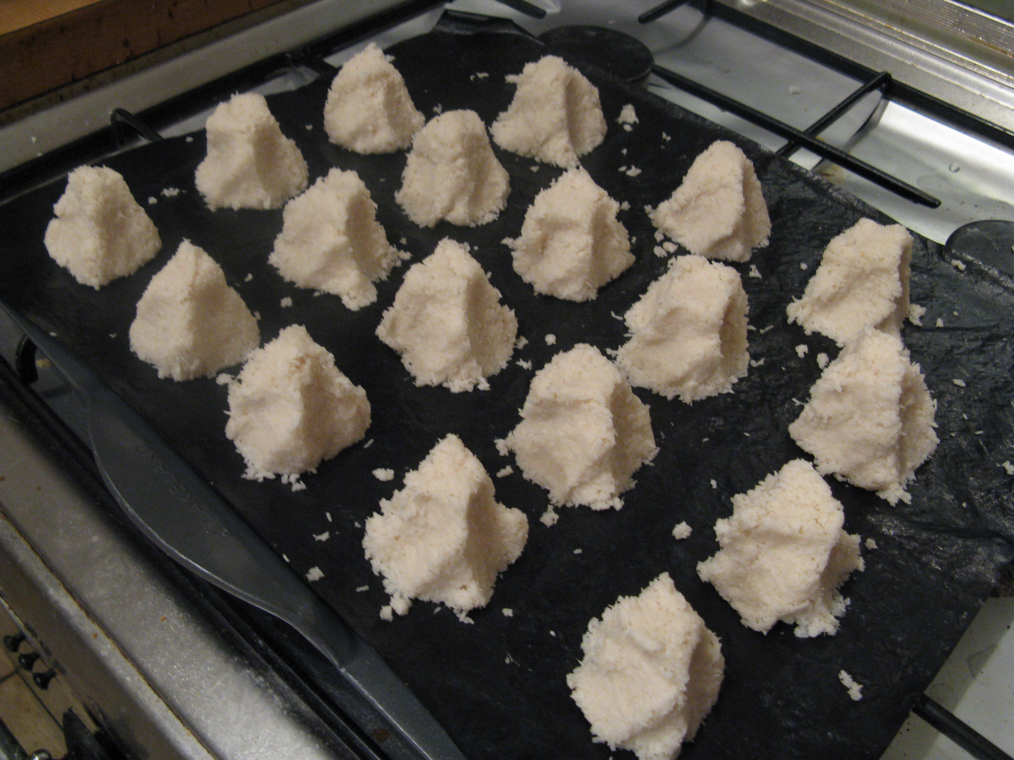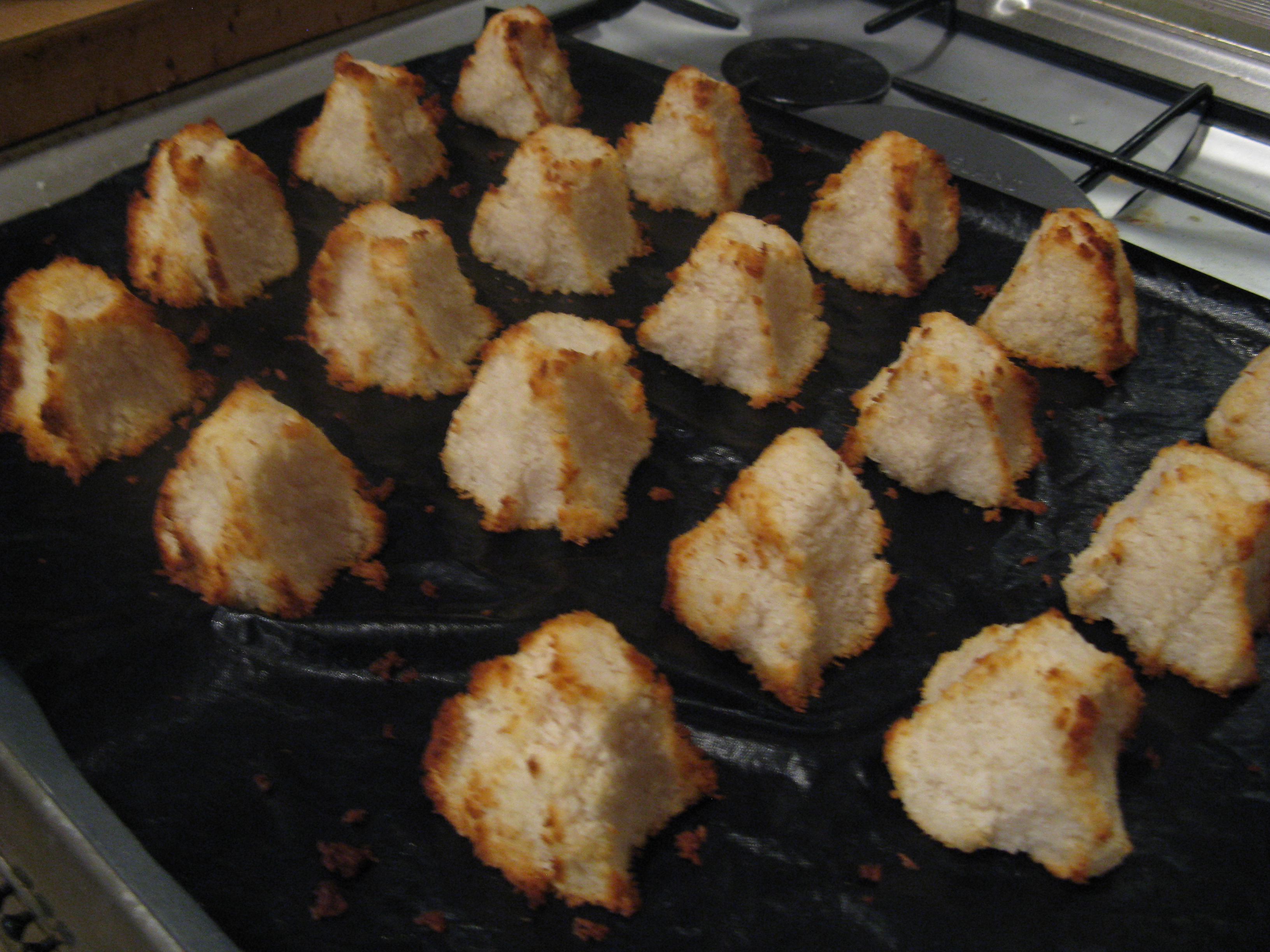 Bounty bars are all very well, but the brown edges you get on a homemade coconut macaroon wins every time! Which is exactly what I baked this week for my work colleagues. The recipe is based on a Cooks Illustrated recipe (subscription required), but I couldn’t find shredded coconut or corn syrup, so I just used more desiccated coconut and finished up a bottle of maple syrup.