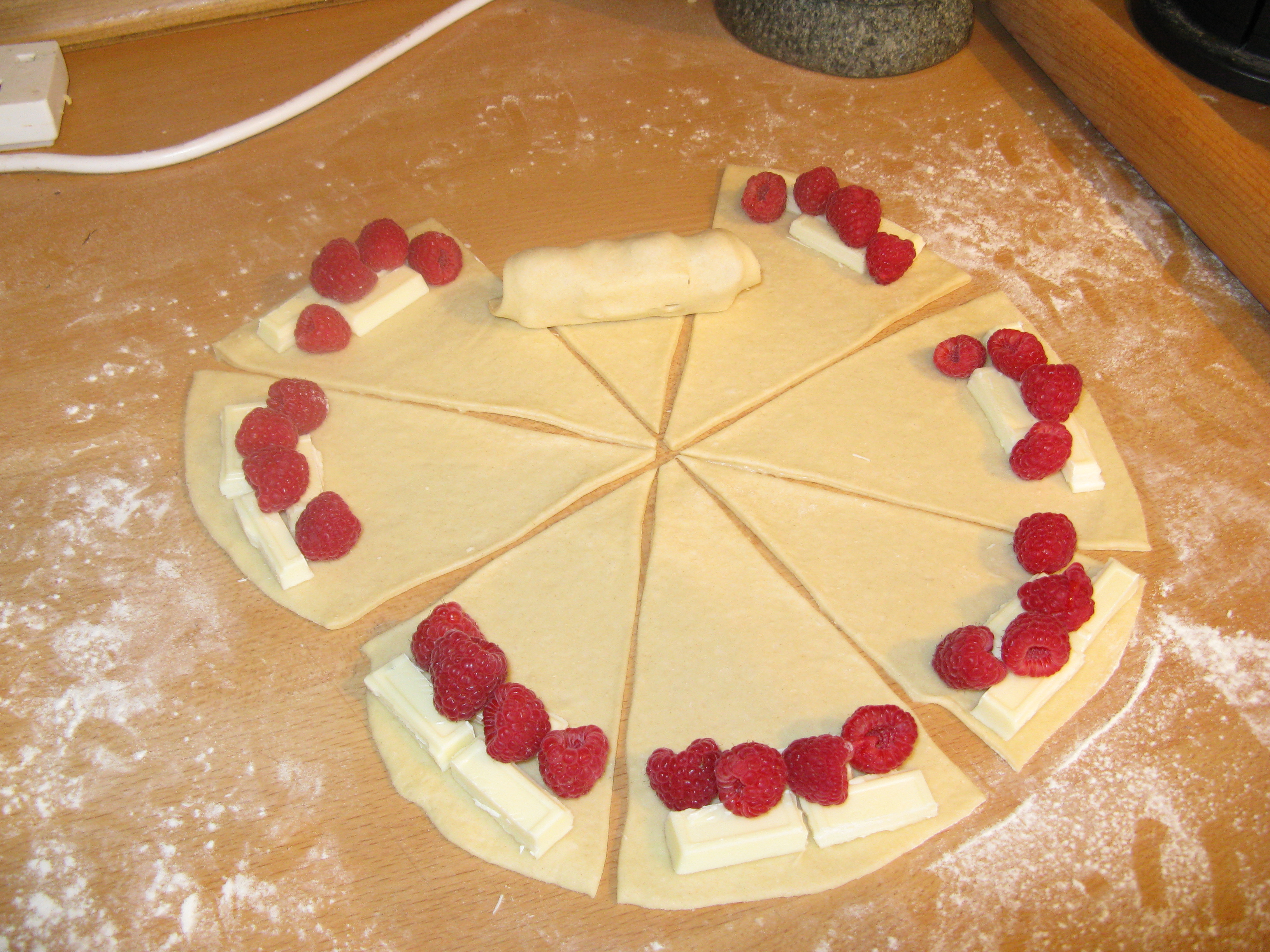 Once kneaded it proves until doubled in size. It’s then split into two halves, andeach half rolled out into a (rough) circle and using a pizza wheel split into 8 slices. Each slice has filling put in it at the edge: