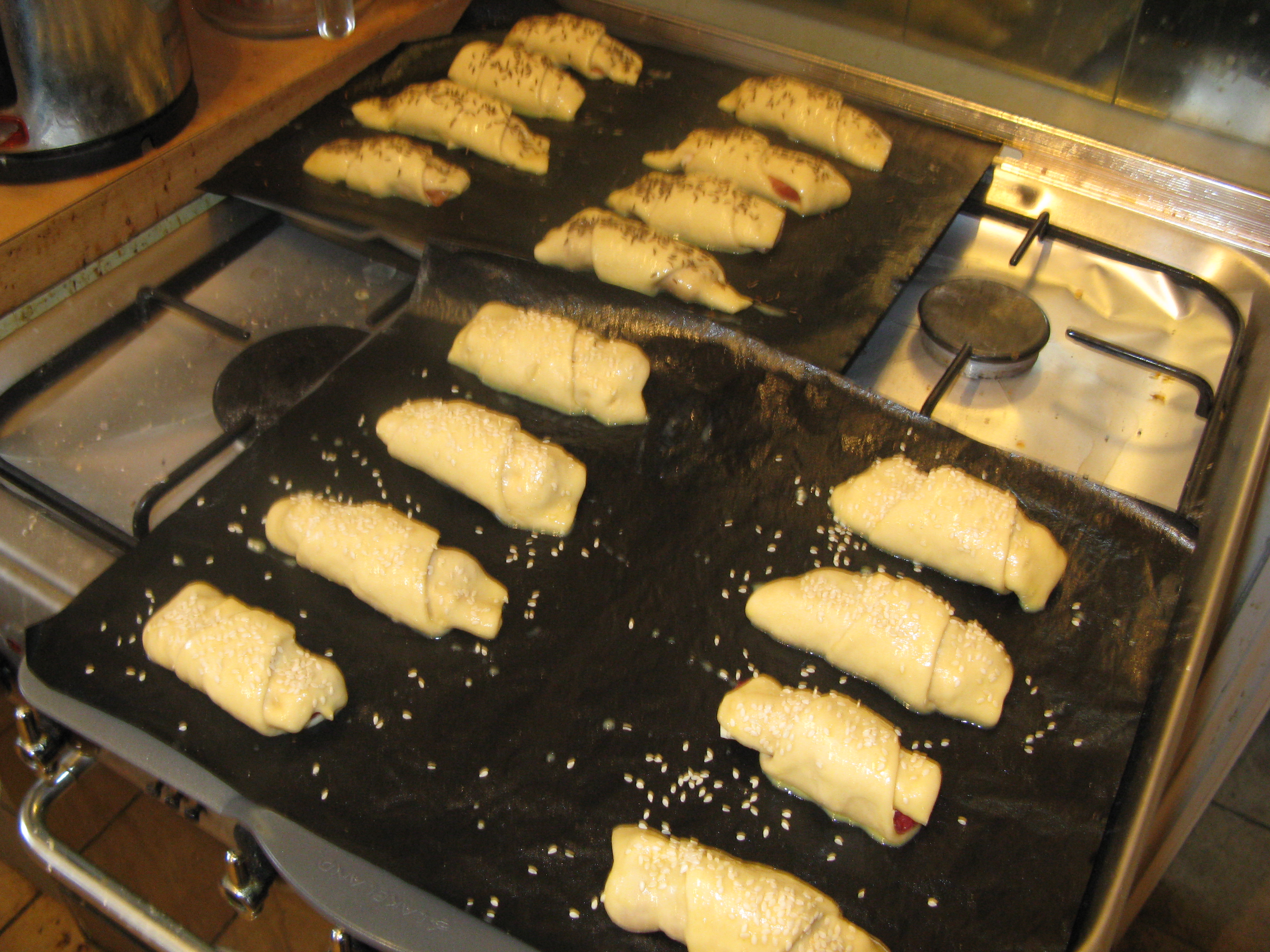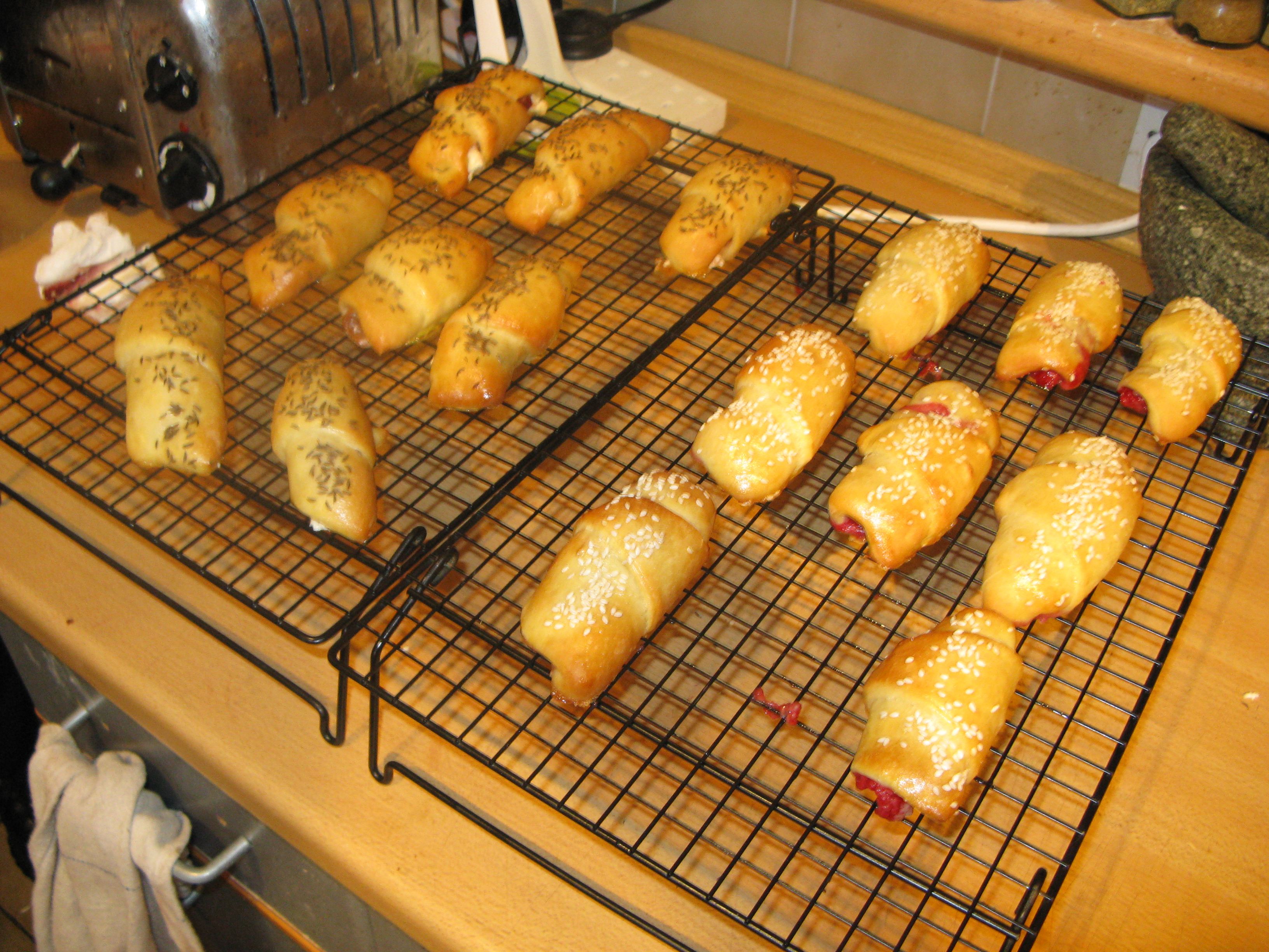 Before baking they get an egg wash and seeds sprinkled on top (caraway for savoury, sesame for the sweet).