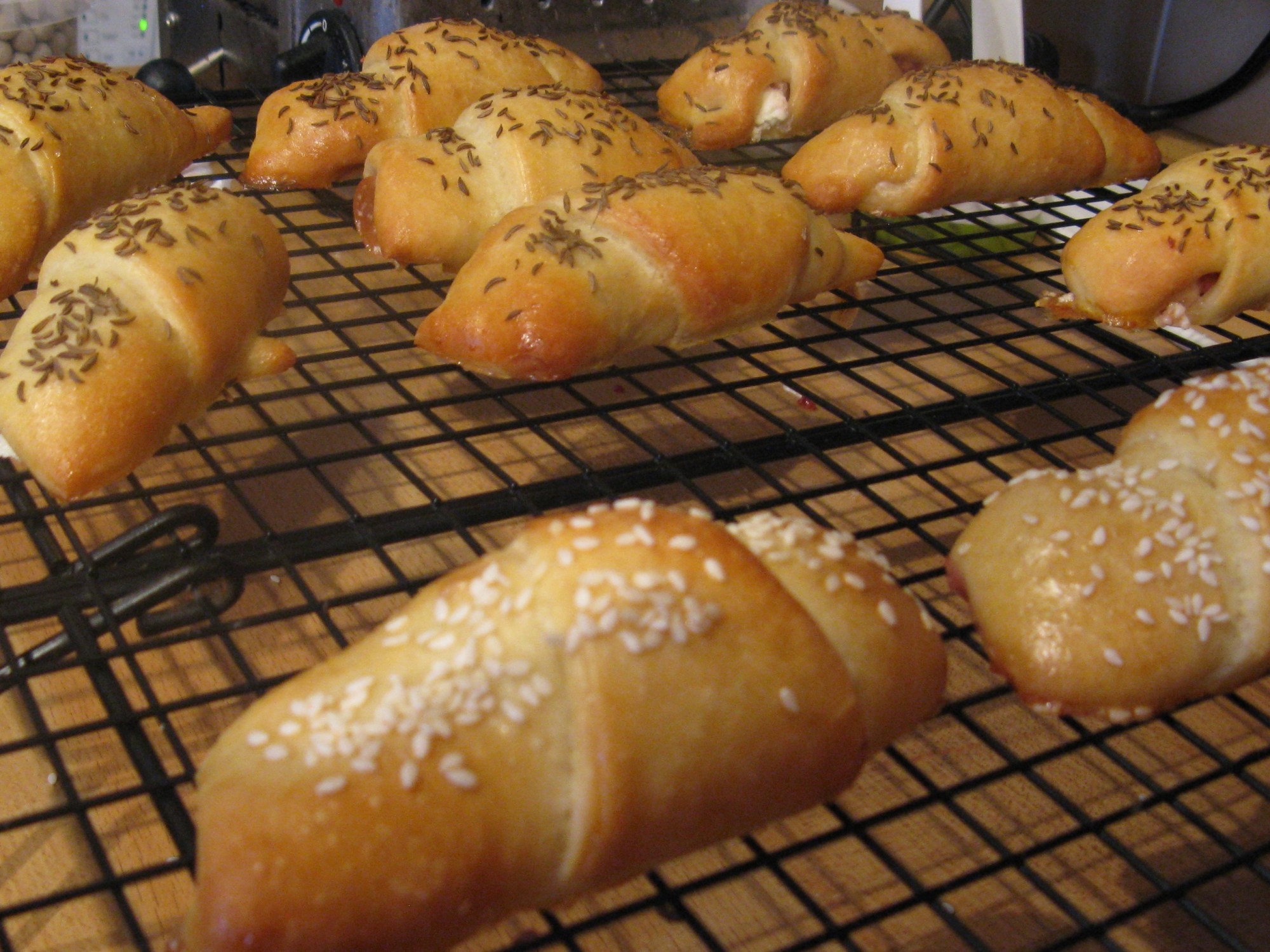 To go with the Hungarian Goulash I searched around for a Hungarian bread and found these crescent-shaped rolls. While searching I found that sometimes Hungarian bread has pork scratching and cheese as a filling. We had some goat’s cheese and parma ham in the fridge not doing anything, so I decided to use those and some fake bacon bits (bacon flavoured crispy soybean flakes) to simulate the crunch of the scratchings.