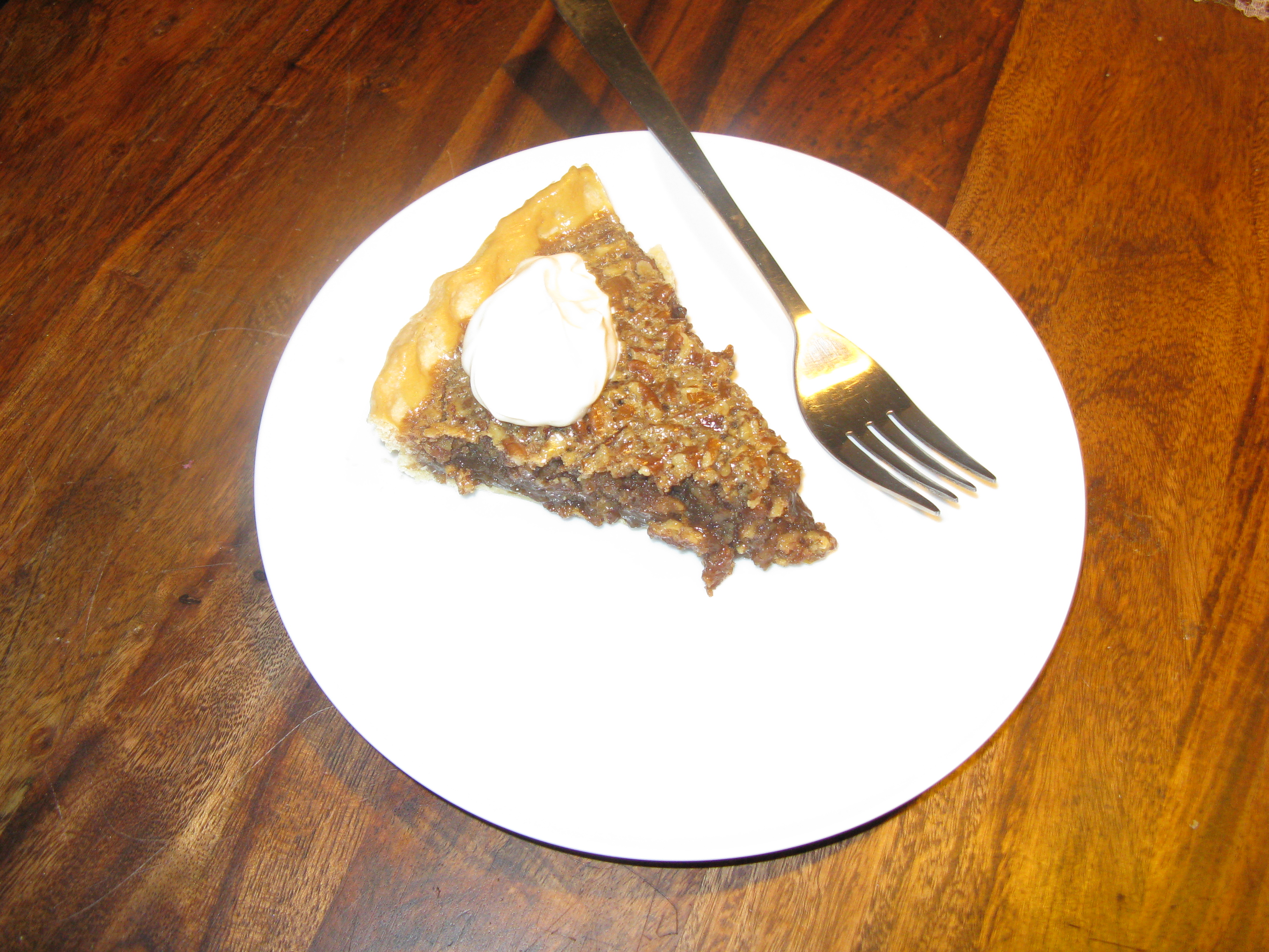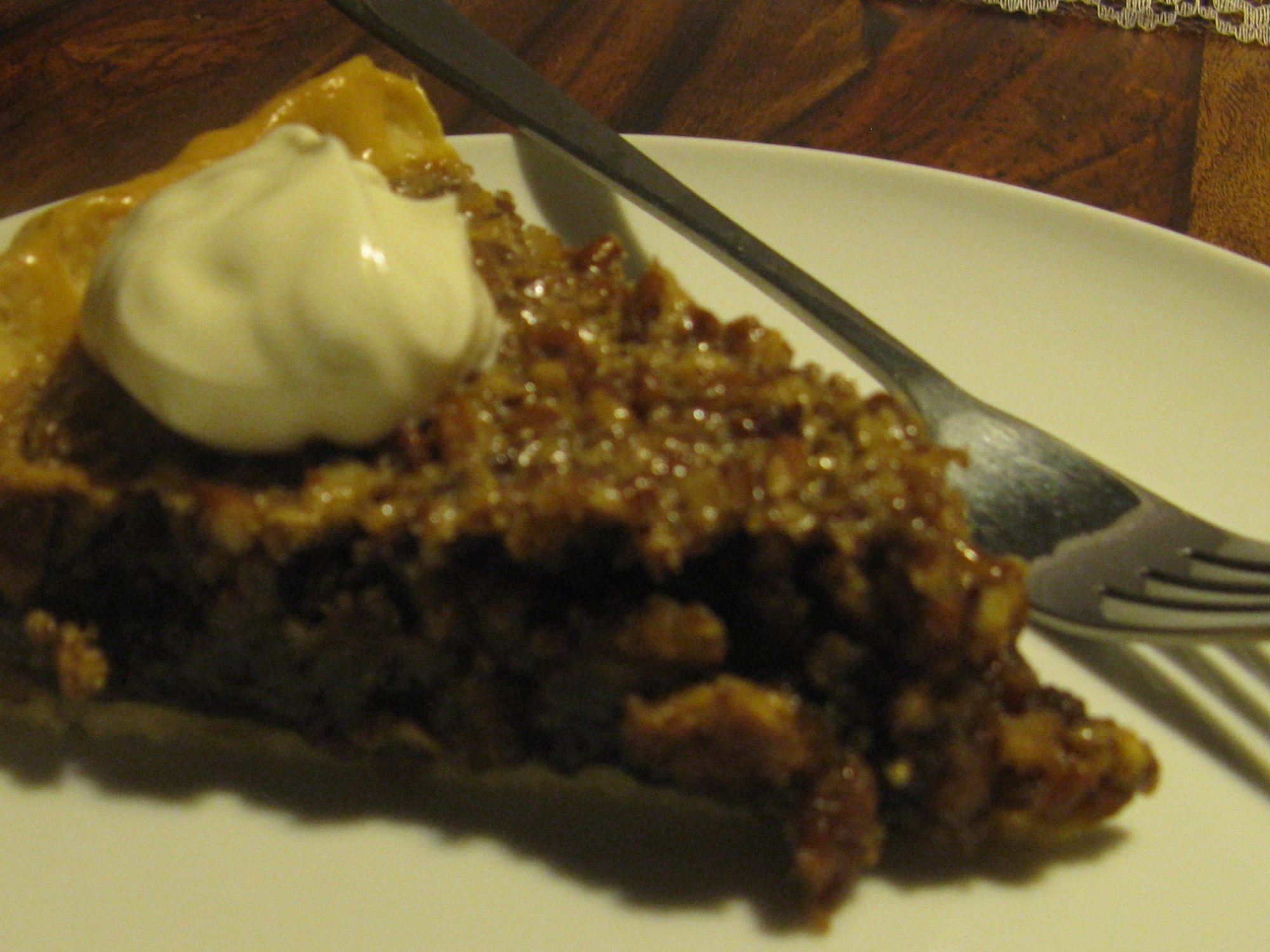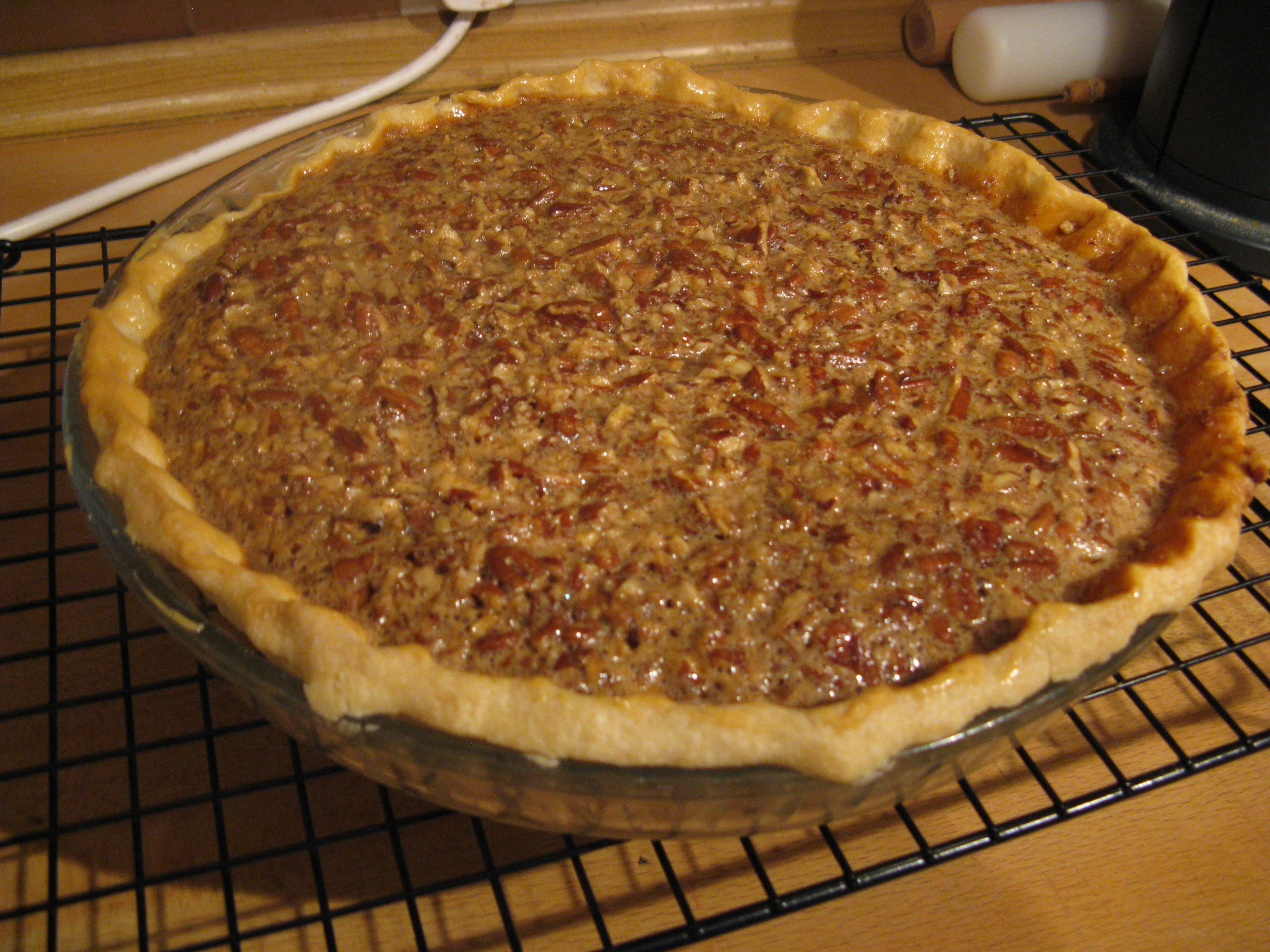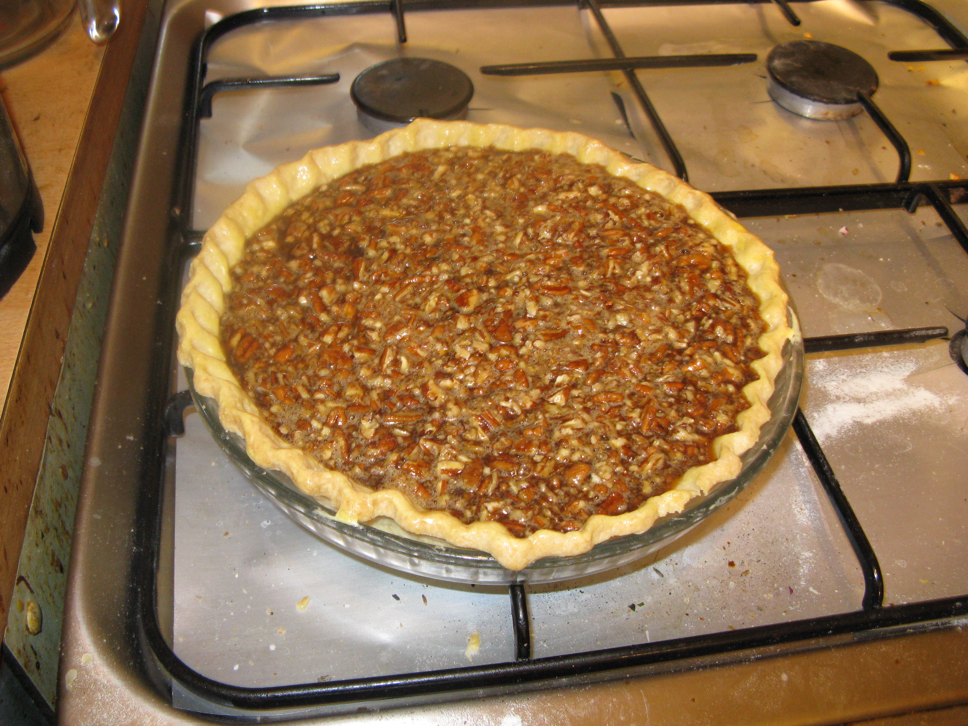 The original recipe was once again odd here (which is strange for Cook’s Illustrated). It called for melting things in water baths and all sorts. I just went with what little I know about making a custard: melt the butter, mix in the sugar and syrup, take off the heat and beat a small amount into the egg/vanilla mix, before whisking the rest in. Then it was returned to the hob until it went shiny, and the pecans were added.