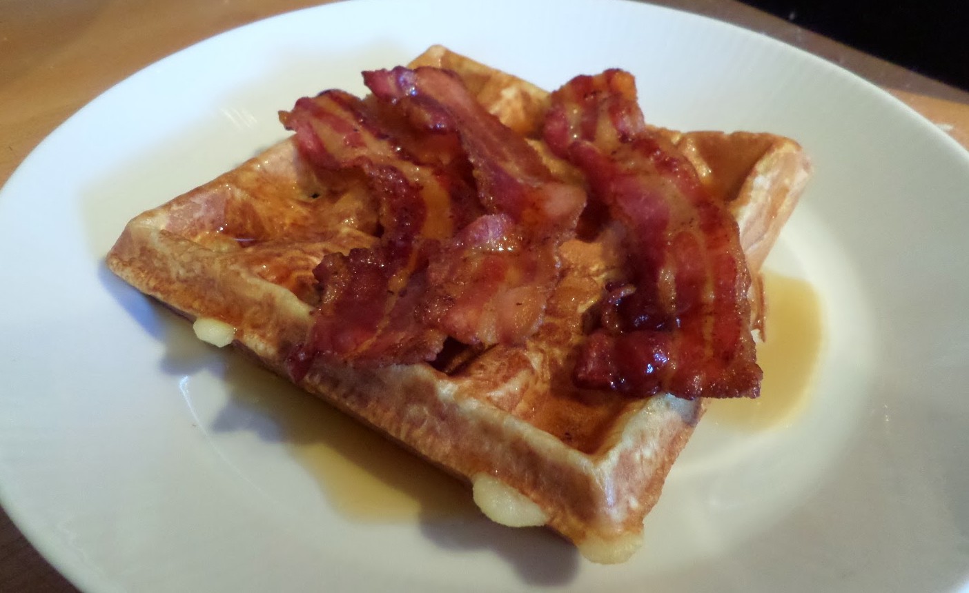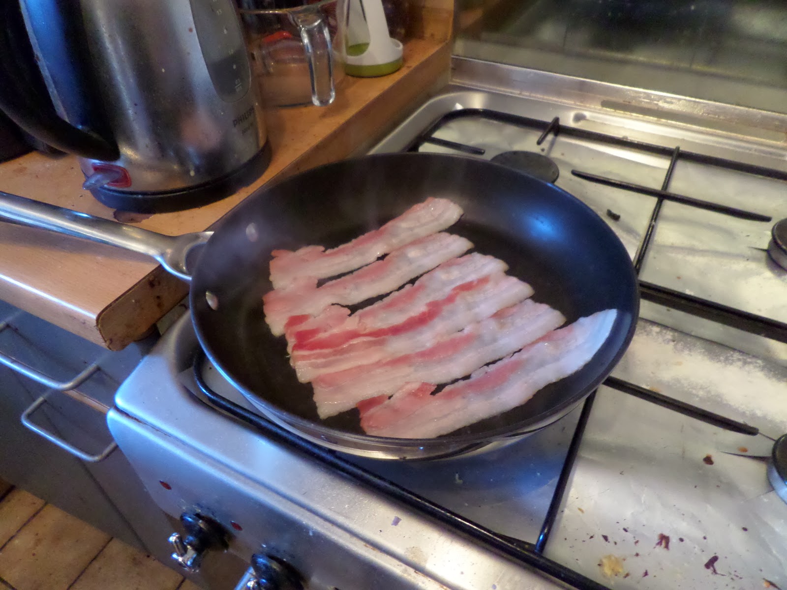 The bacon is the streaky type, for authentic american waffles. It goes in a cold non-stick frying pan, and then a low heat is turned on. We do this so the fat renders out as the pan heats up, rather than putting in a hot pan and the fat staying in the bacon.