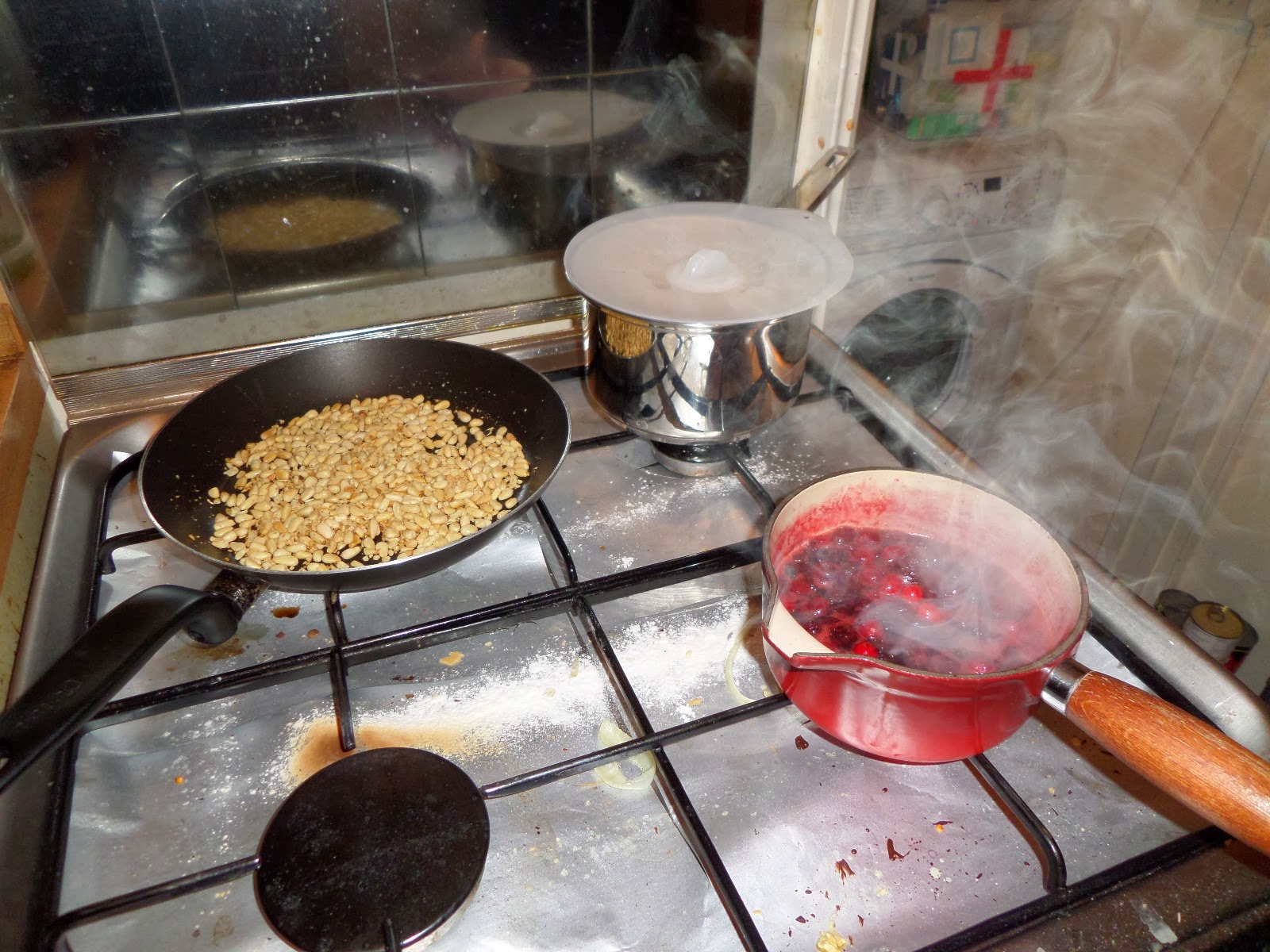We’ll boil up the sprouts, then finish off by frying with bacon, and sprinkling with pine nuts. Mmm…. bacon.