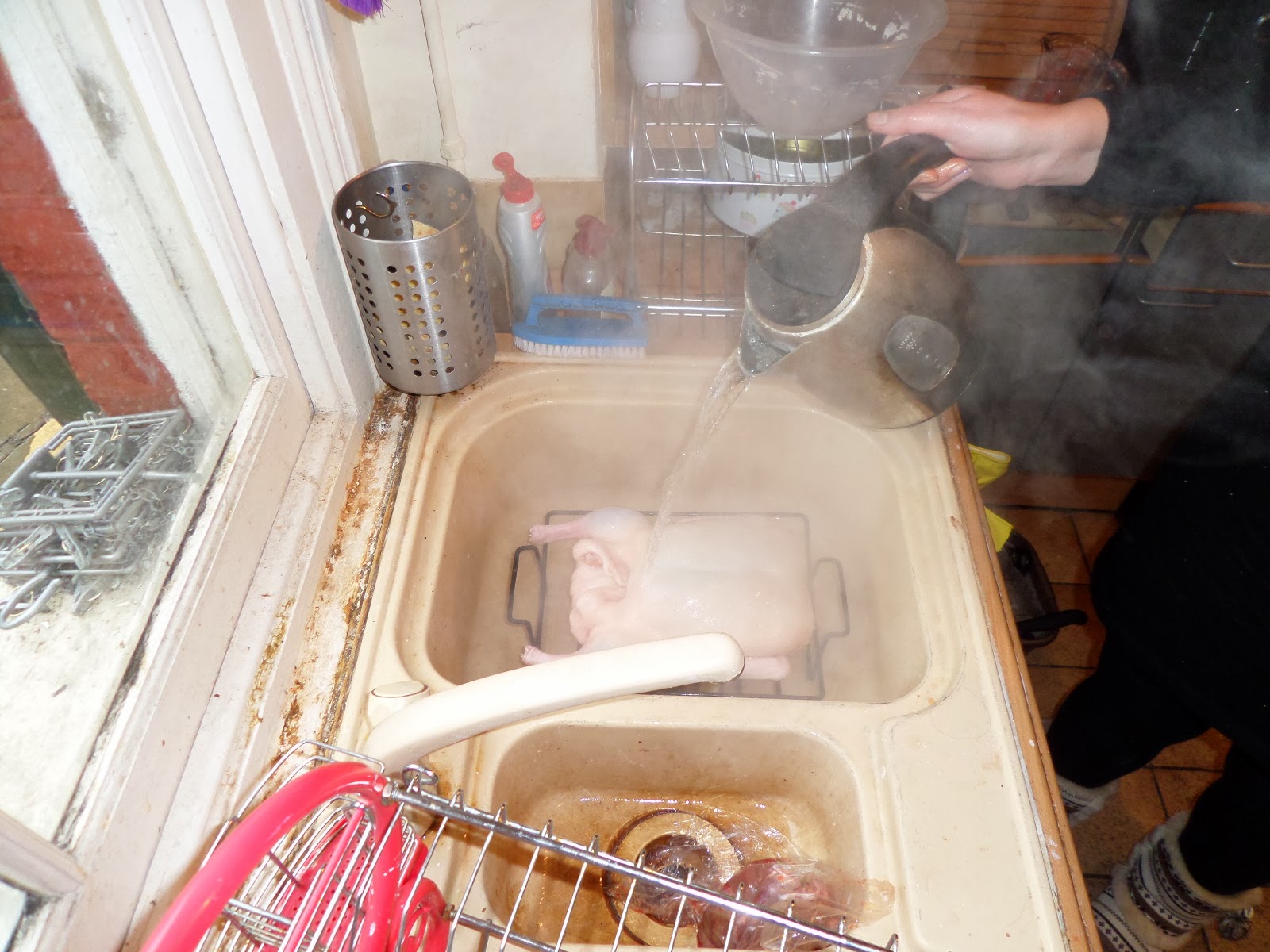 The duck gets pocked with a carving fork, then boiling water is poured over a few times, then it stands for 45 minutes to dry out before getting salted. This is all to dry out the skin so it’s crispy rather than fatty and flabby.