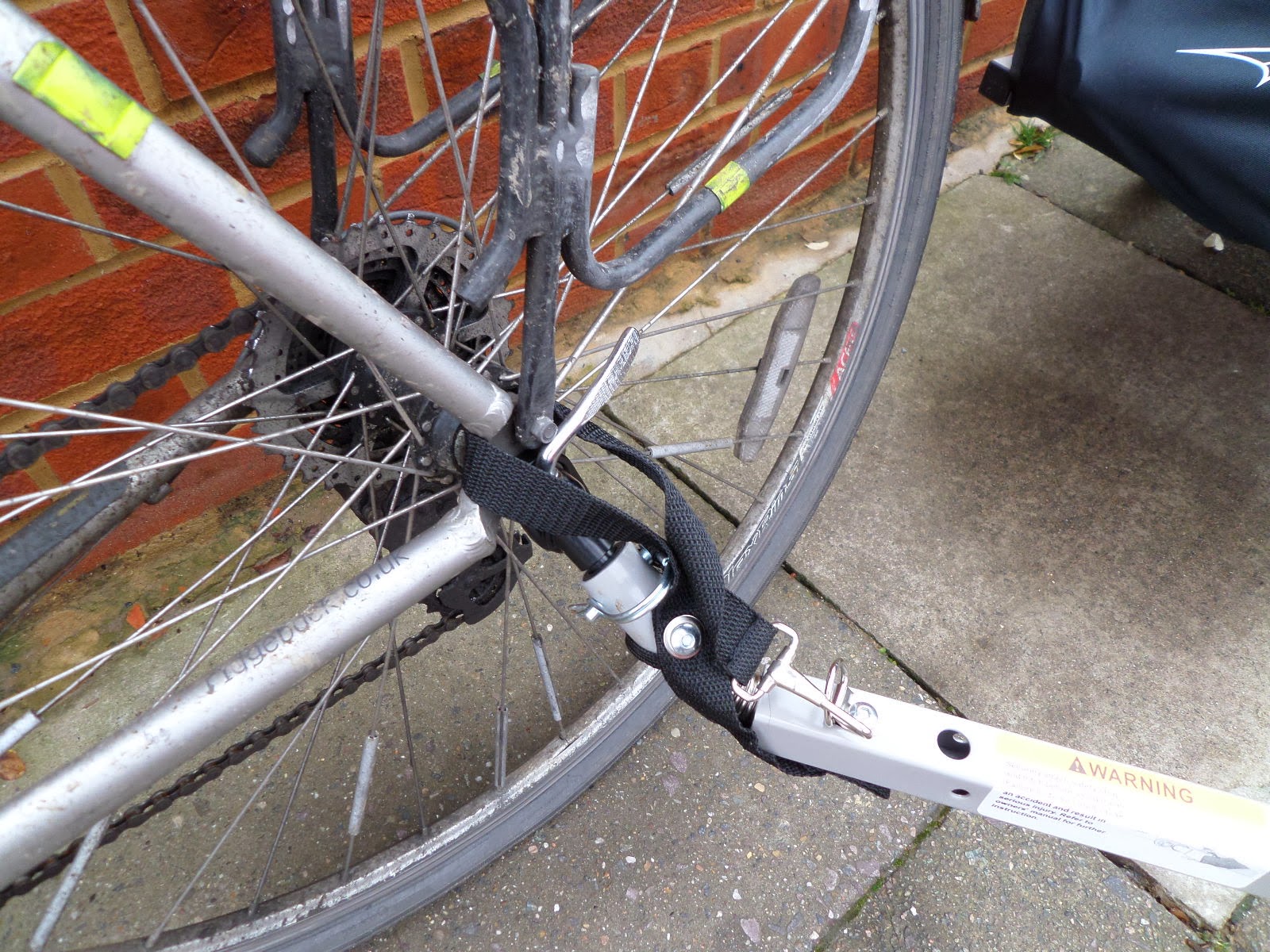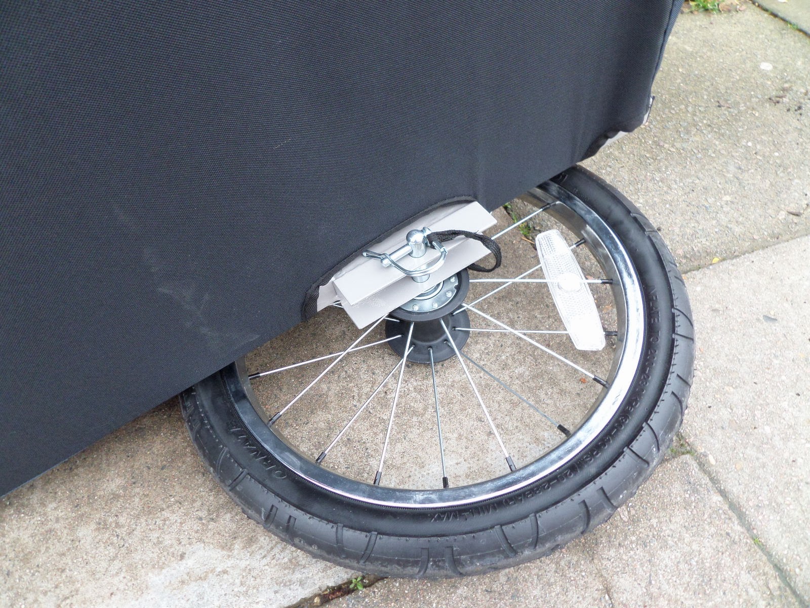With both wheels attached, we’re ready to attach to the bike. This is done via the rear wheel’s axel. I’ve got quick-release wheels, so I don’t even need any tools for this stage.