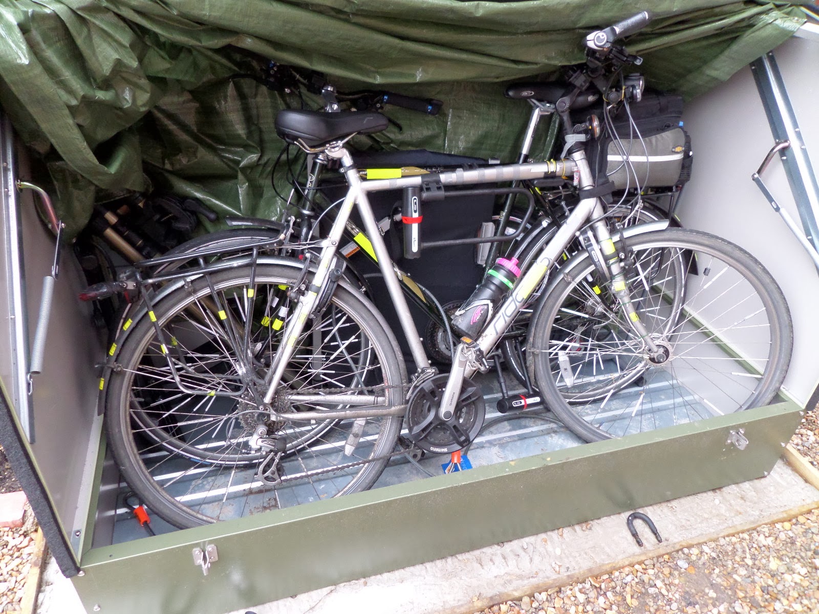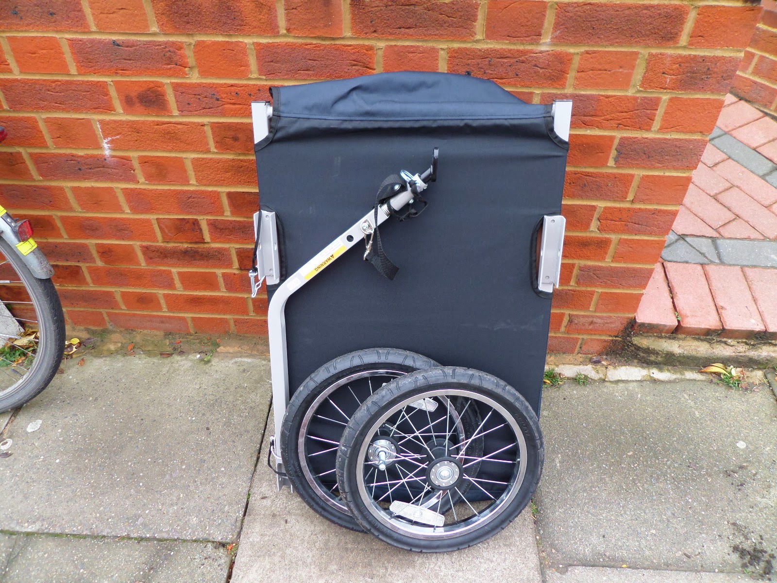 So the trailer I got is the Avenir TRA083 Mule Utility Trailer. It fold down flat, and the wheels detach, and so I can store it in the secure bike shed behind the bikes, along with the bike stands and my folding pannier basket / trolley.