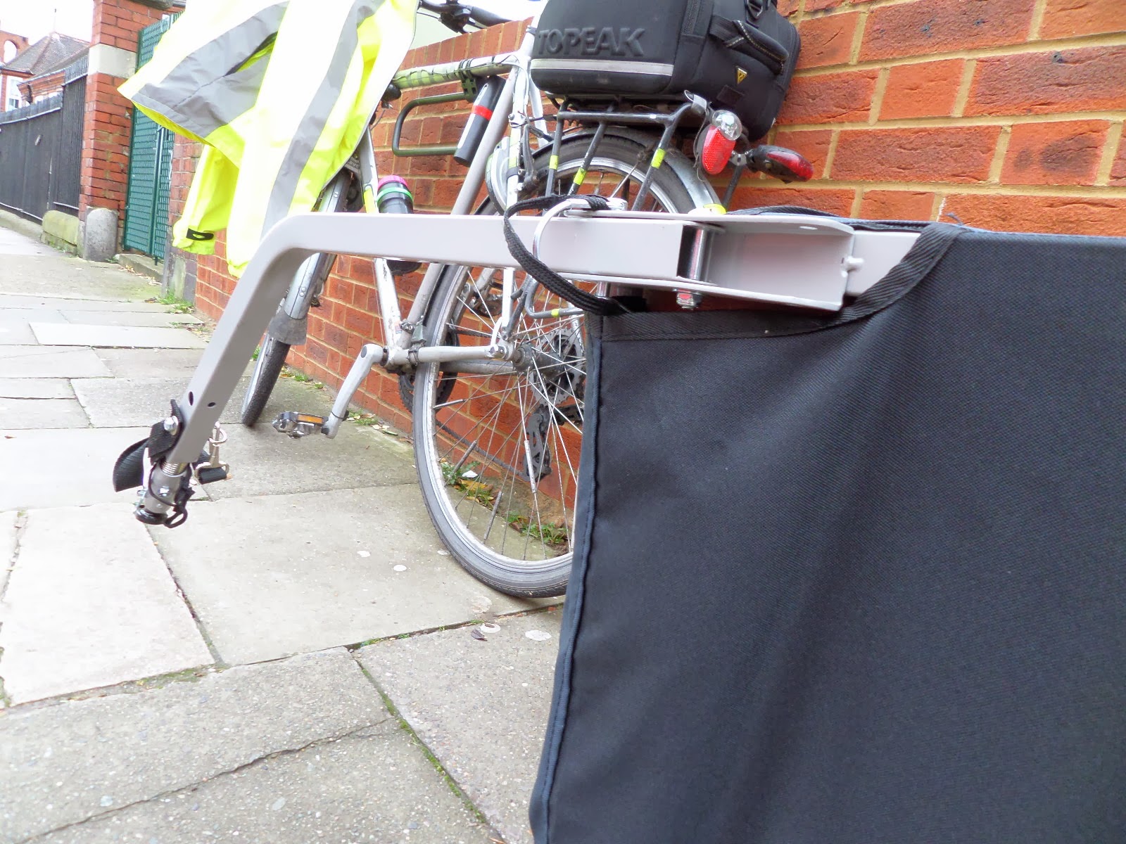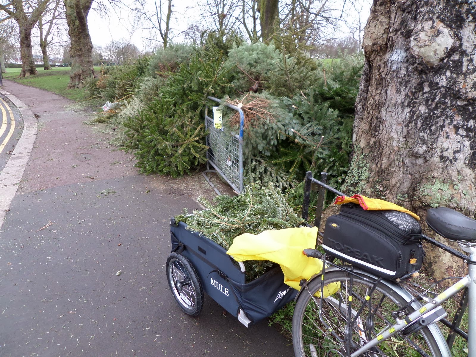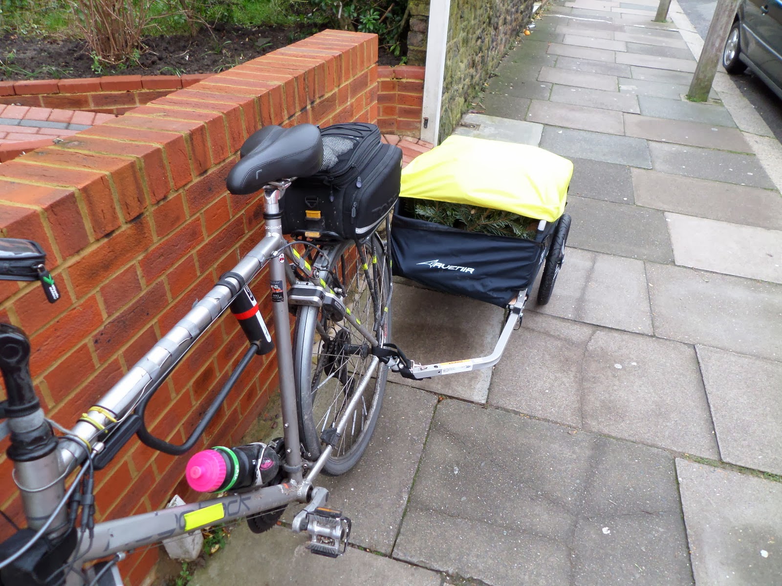 I’ve been asked to show how it attaches to the bike, so as I was using it in anger for the first time today (to take the Christmas tree to be recycled — more smugness!) I thought I’d document it here.
