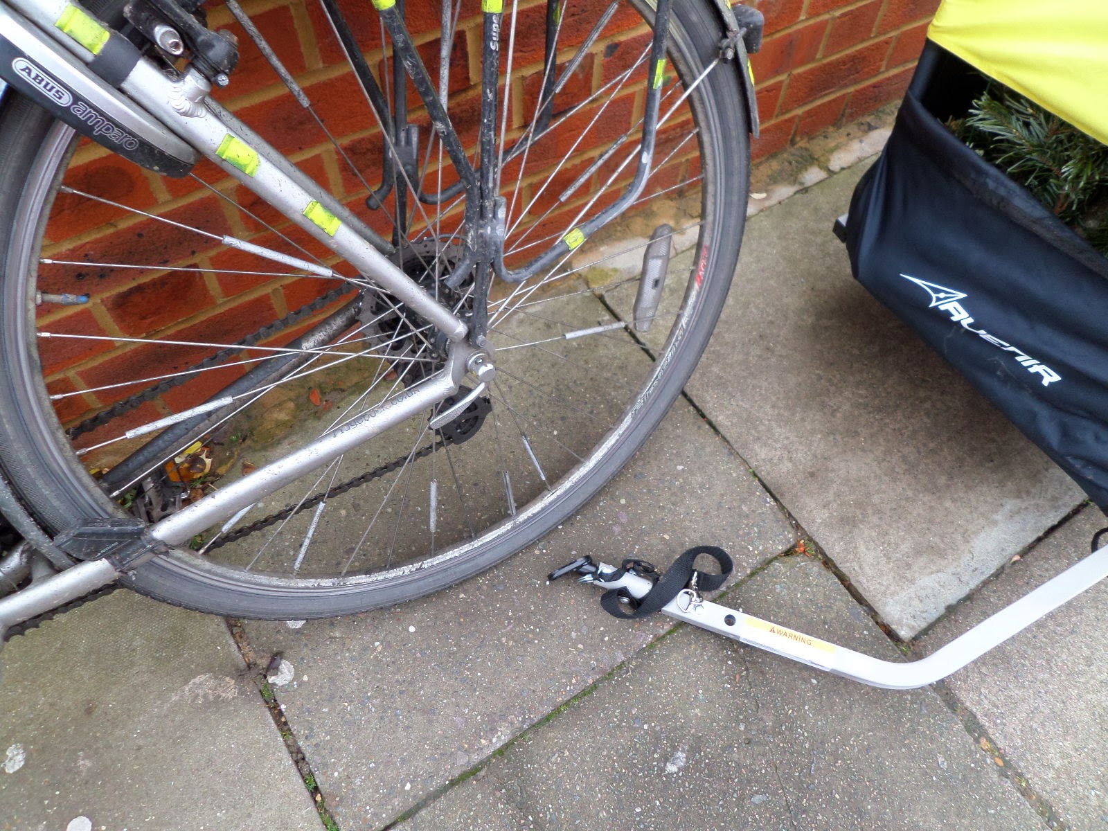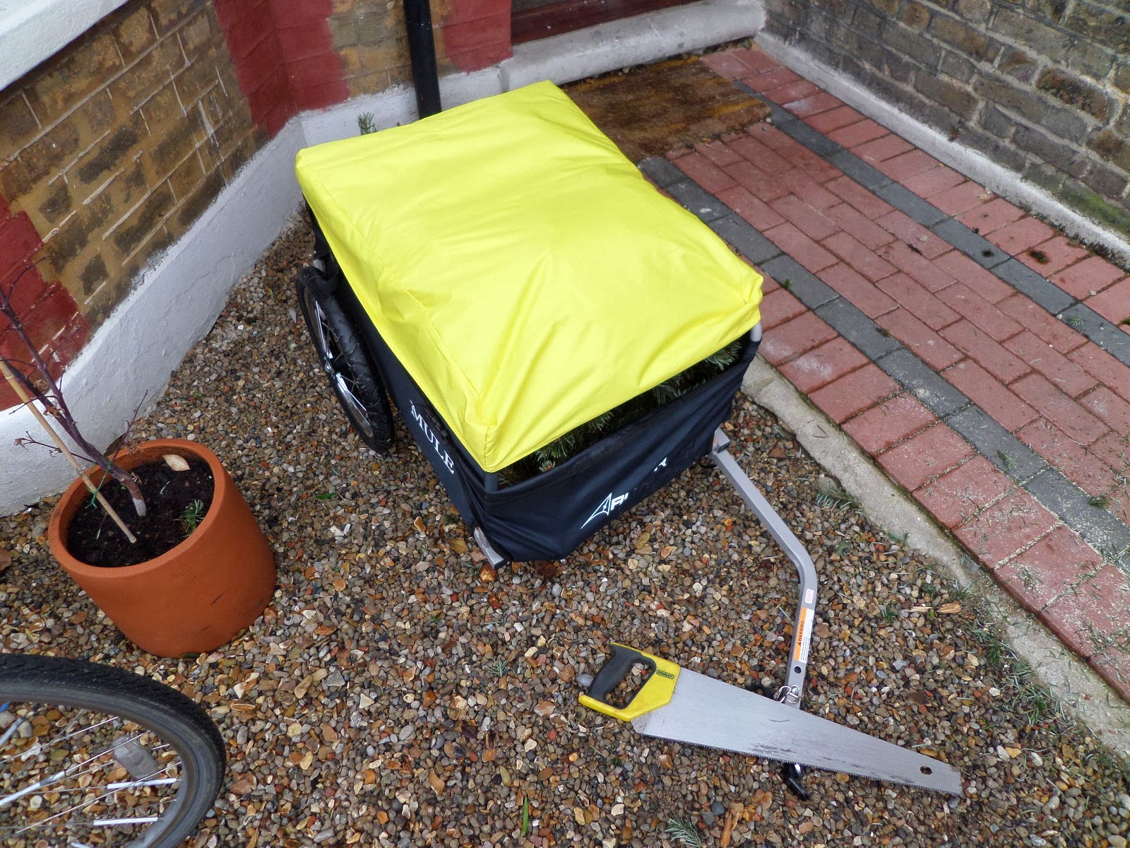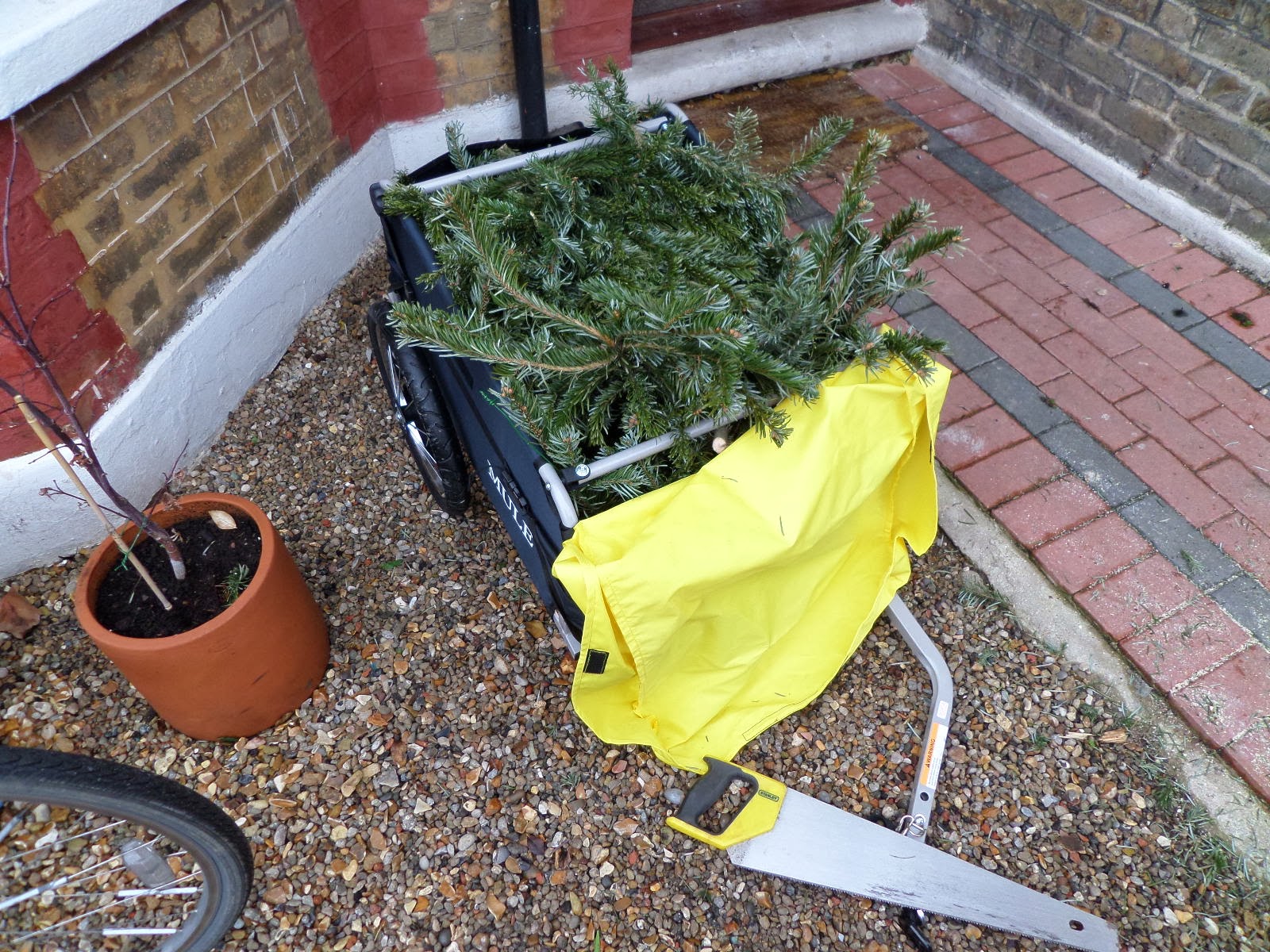 I’ve been asked to show how it attaches to the bike, so as I was using it in anger for the first time today (to take the Christmas tree to be recycled — more smugness!) I thought I’d document it here.