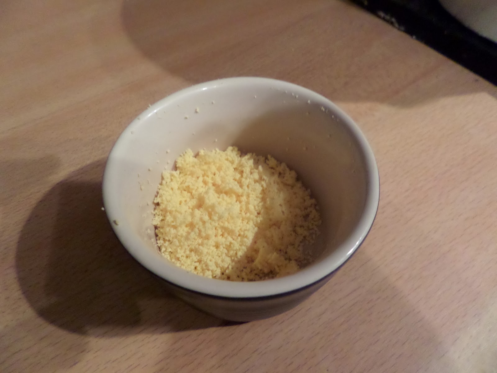 After all this grinding of green tea and sieving egg yolks, it’s onto normal biscuit baking: cream the butter, sugar, salt & egg yolk, then mix in the flour and green tea powder. Unfortunately I forgot to add the green tea powder with the flour, so had to add it afterwards, which took some time to combine, so it probably got over processed.