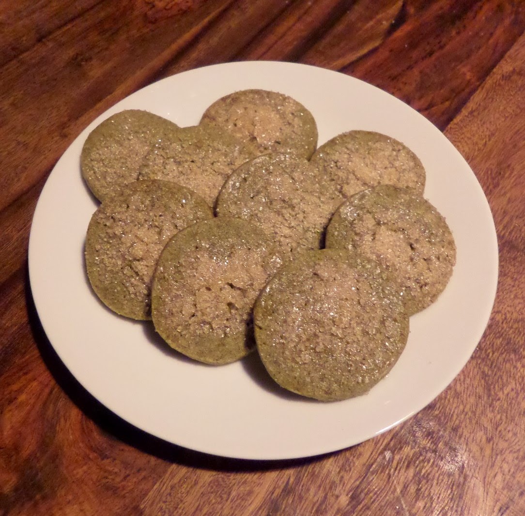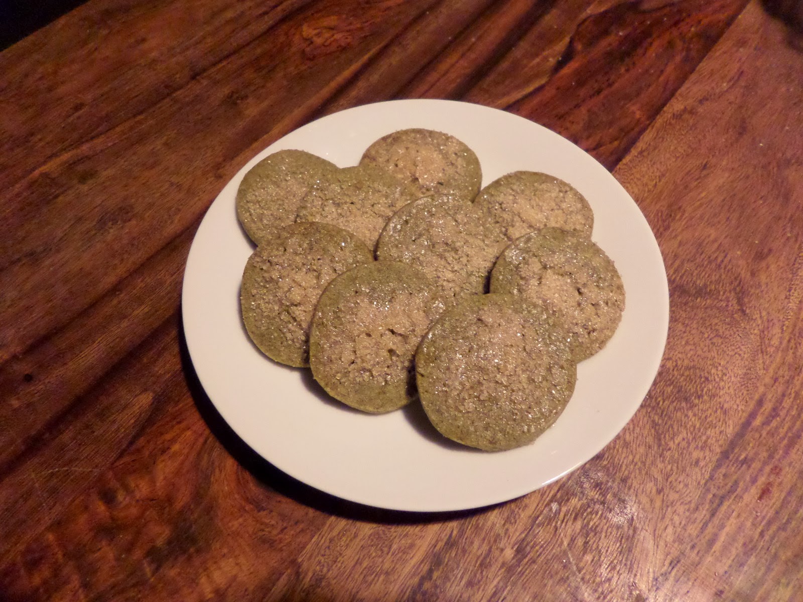 The excess sugar hadn’t melted properly, but the edges seemed just browned, and after they cooled they were nice and crispy without being over done. They tasted mainly of butter and sugar, with the green tea only being a very subtle undertone. So they taste great… due to butter and sugar.