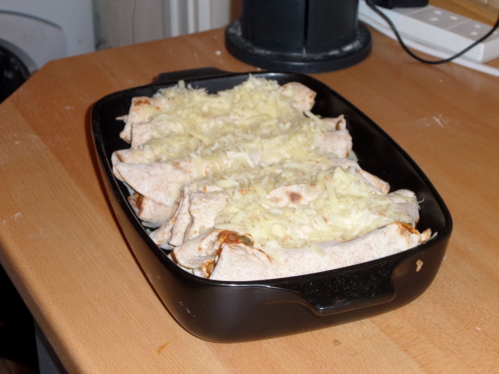 Then: a layer each of the microwaved pilaf and chilli go into each tortilla, which then get rolled up and put in a baking dish, and half-fat cheddar gets sprinkled on top. Sounds easy but rolling the tortillas is rather fiddly, but it worked out OK in the end.